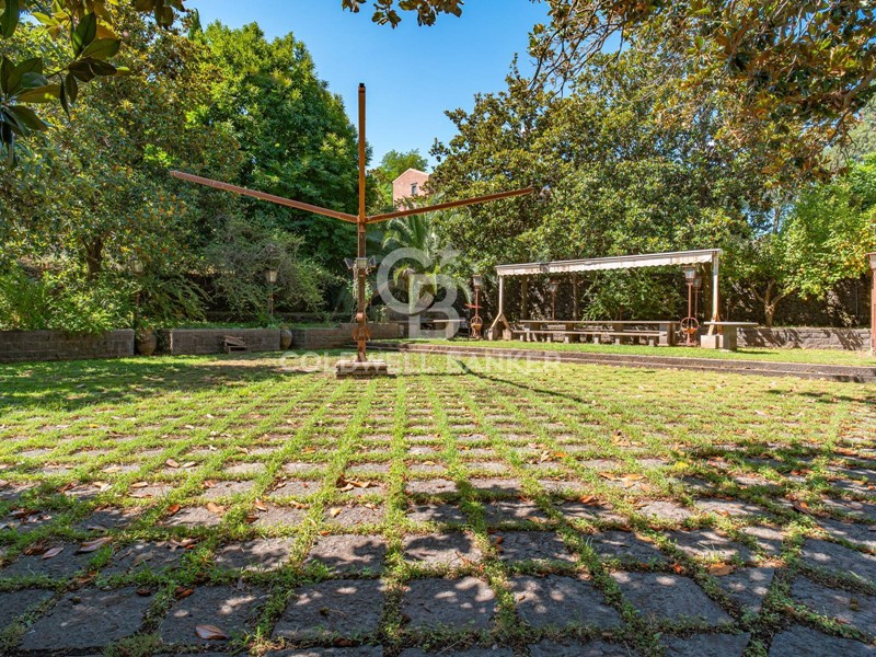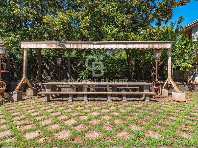 Corte retrostante con grande gazebo in pietra lavica, barbecue e fontana decorativa circondata da piante ornamentali;
