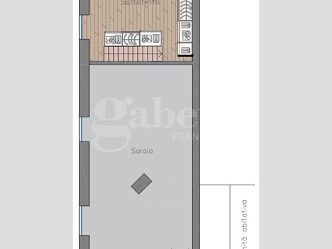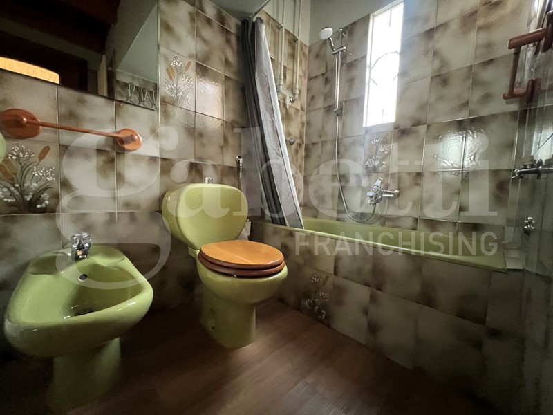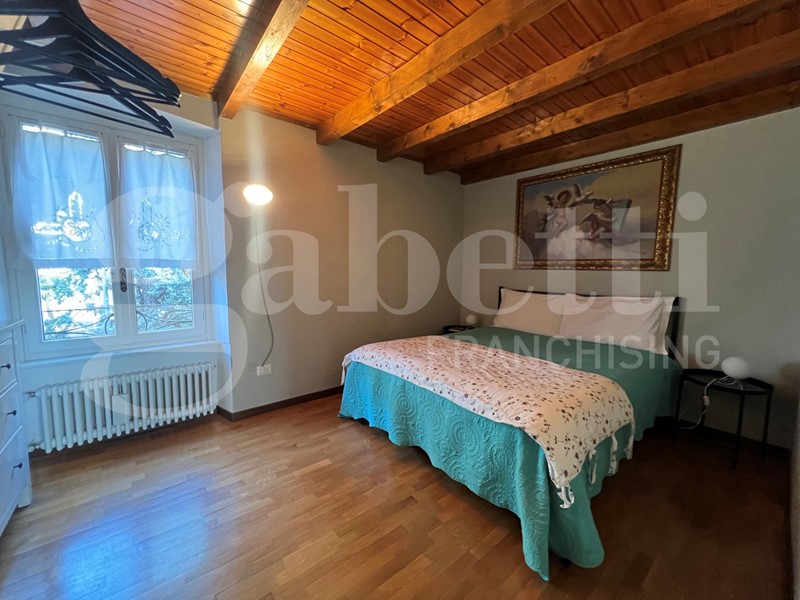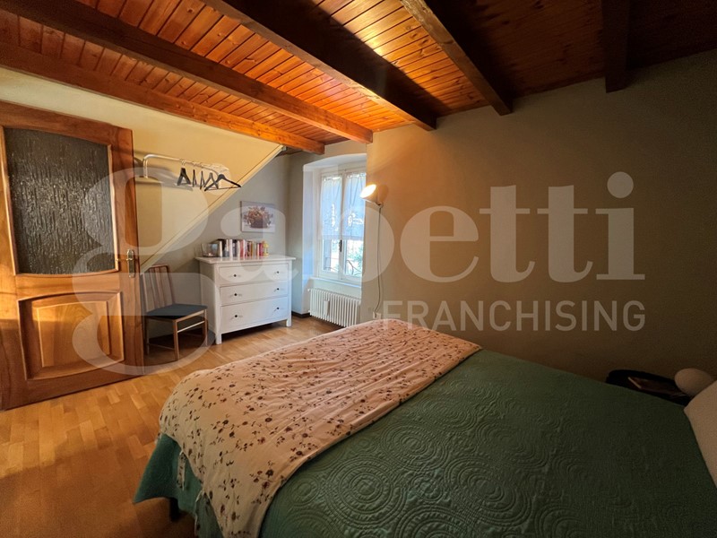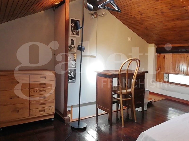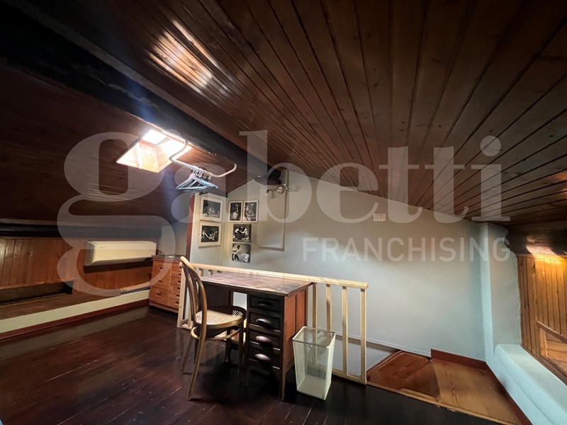 Una scala interna in legno conduce al sottotetto, finemente rifinito con finiture in legno, ideale come spazio accessorio.