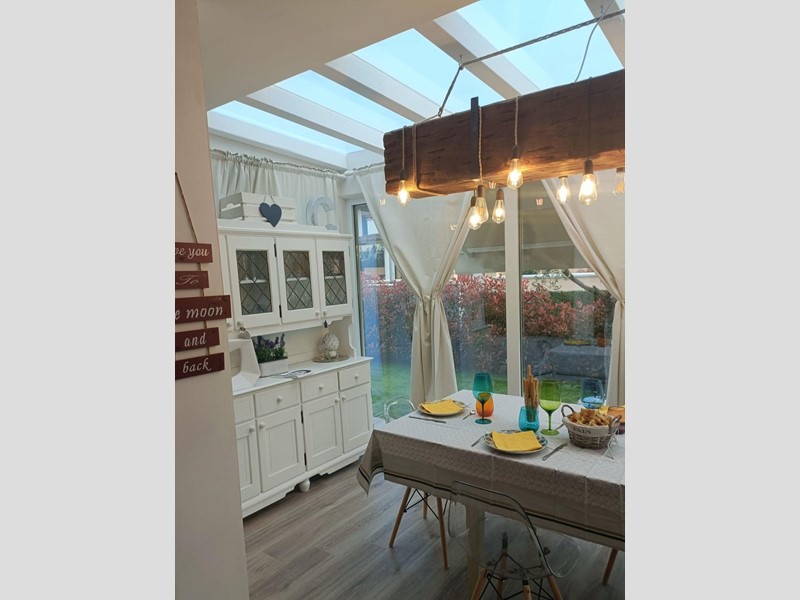 L’ingresso avviene tramite un vialetto privato che conduce alla veranda, dalla quale si accede alla zona living con soggiorno, zona pranzo e cucina a vista in stile moderno.