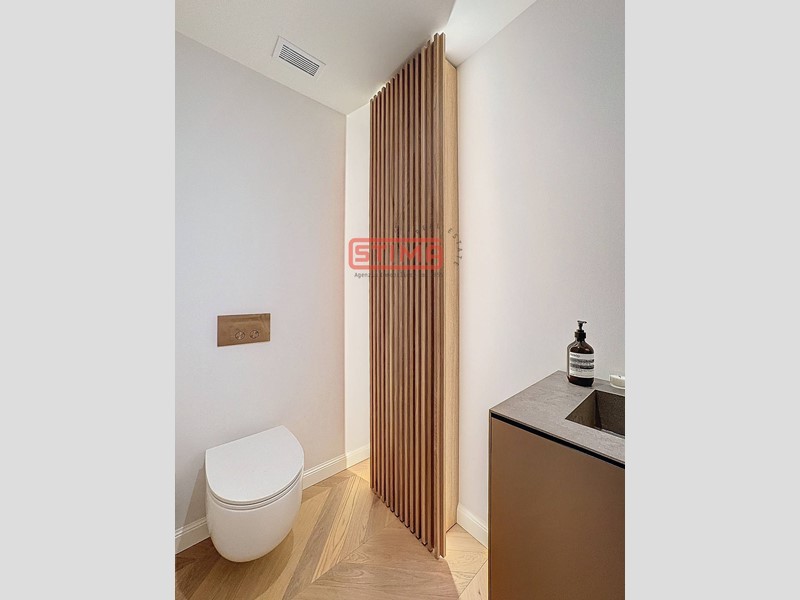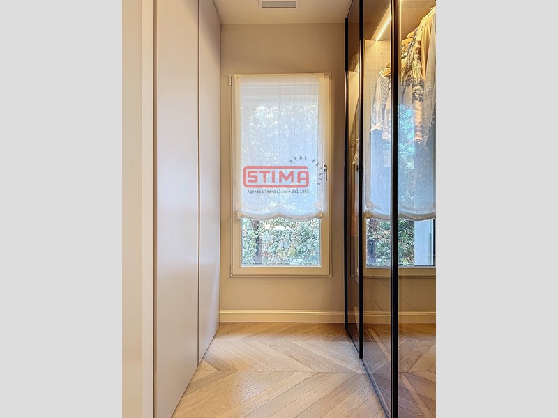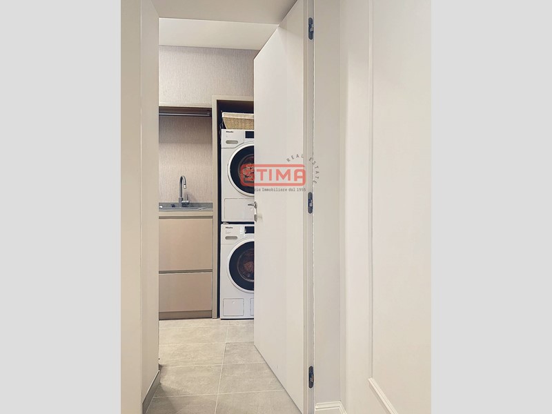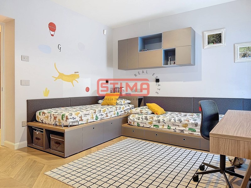 Zona notte funzionale ed elegante: Un corridoio con raffinata boiserie conduce a tre camere, ciascuna con bagno en suite, mentre la master suite include anche un comodo guardaroba. La lavanderia, ben organizzata, è posizionata strategicamente per garantire praticità e discrezione.