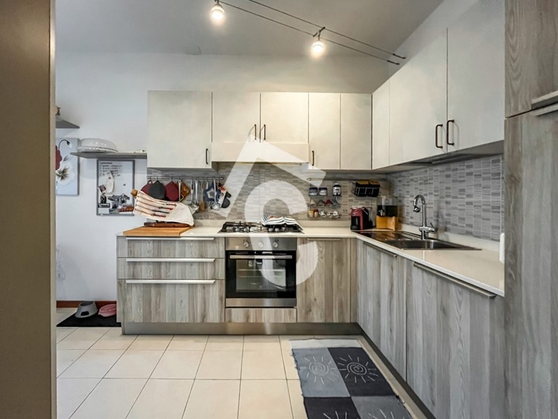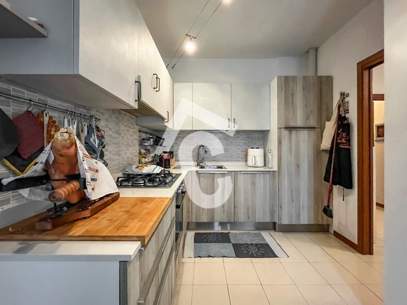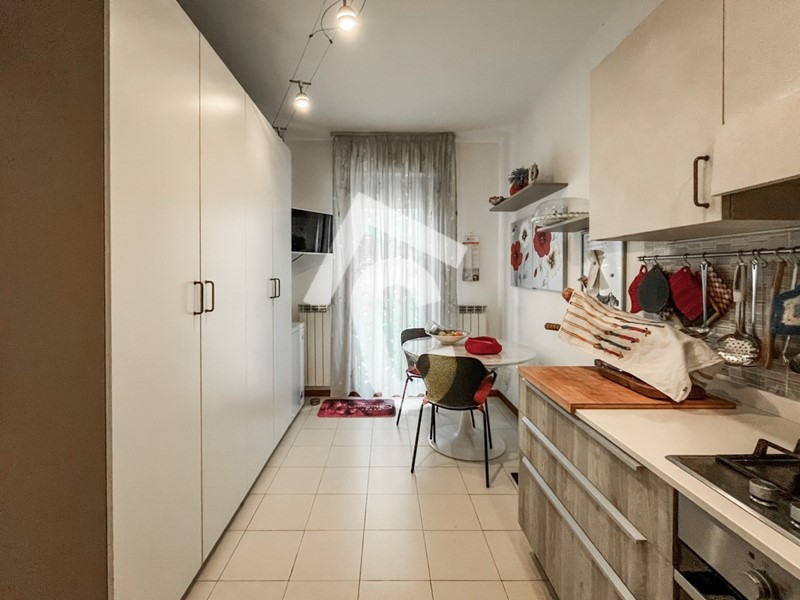 L’immobile è posto al secondo ed ultimo piano di un condominio servito da ascensore e si apre su una luminosa zona giorno, ampia e accogliente, con accesso diretto al balcone. Da qui si accede alla cucina abitabile separata, pratica e funzionale.