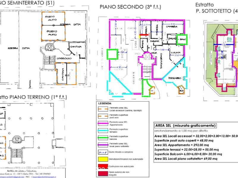Appartamento occupante l’intero secondo piano (terzo f.t.), generato alla fusione di due originari appartamenti serventi il piano, l’appartamento risulta così composto: ingresso living su soggiorno, cucina, quattro bagni, sei camere, lavanderia, locale giochi, due disimpegni, due terrazzi, due ripostigli e tre balconi. Completano la proprietà:- locali accessori e un bagno al piano sottotetto (quarto f.t.) non direttamente comunicanti con l’unità principale ma raggiungibili tramite la scala comune;- due ripostigli al piano terreno;- due cantine pertinenziali al piano interrato, accessibile dal corpo scala comune;- due posti auto coperti al piano interrato, accessibili da rampa e corsia di manovra comuni.