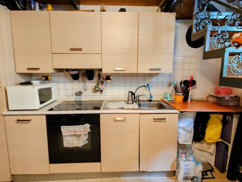l'immobile è composto da: al p.t. Soggiorno con cucina, al piano sottostante camera con letto a castello, al piano superiore seconda camera con letto matrimoniale, un bagno.