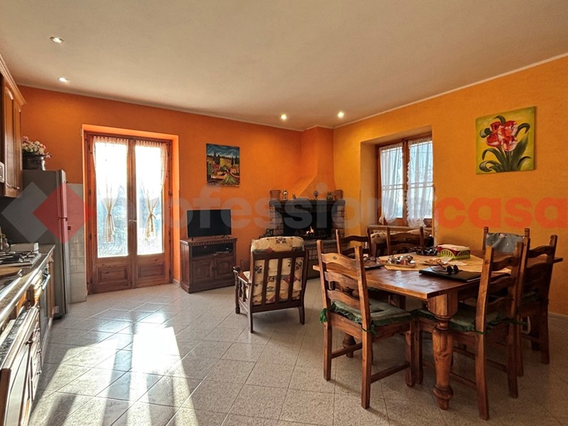 L'immobile si sviluppa su due livelli. Al piano terra troviamo l'ingresso che conduce in un soggiorno caldo e accogliente, con cucina a vista e un camino che diventa protagonista dell'ambiente. È il classico angolo dove immagini una serata d'inverno, magari in compagnia, con la fiamma che crea atmosfera. La zona notte è composta da tre camere da letto e un bagno.