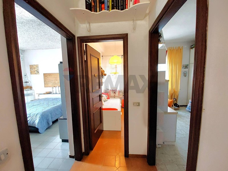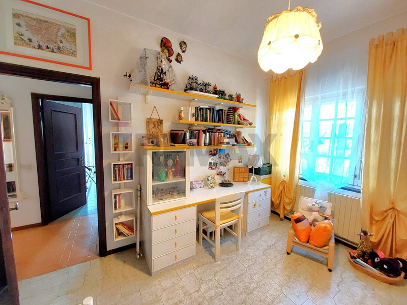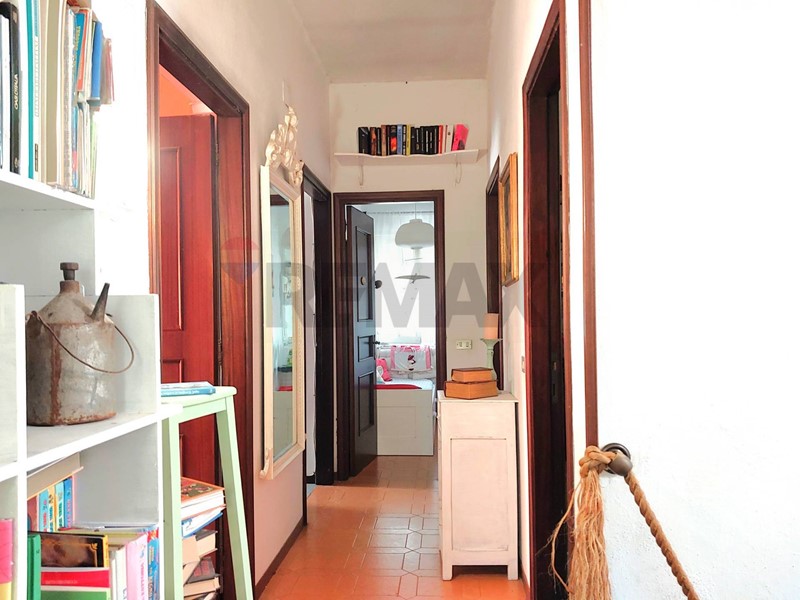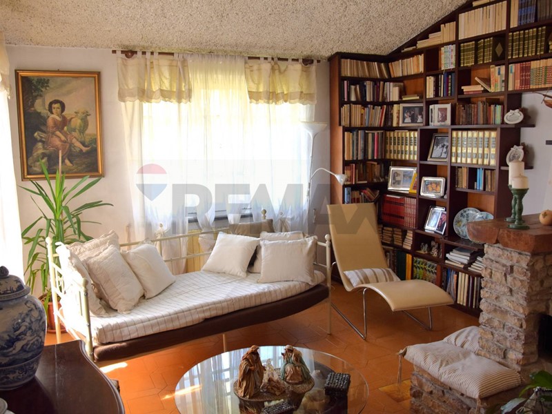 Immenso terrazzo, ingresso, salone, zona pranzo e cucina, ripostiglio, bagno. Al 1° piano: bagno e 3 camere da letto, una con terrazzo; studio.