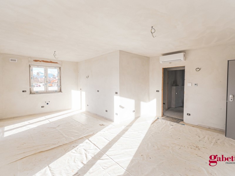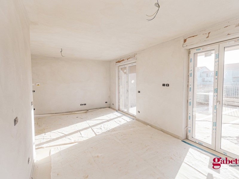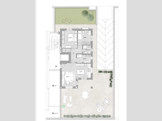 Situato al piano terra di un complesso residenziale signorile in costruzione, l'appartamento si compone con ingresso su zona giorno open - space, disimpegno, due camere da letto, due bagni, ripostiglio e l'area esterna esclusiva, ad uso giardino, portico e lastrico solare.