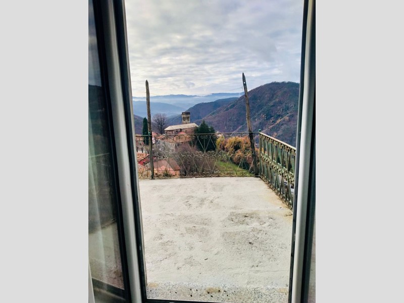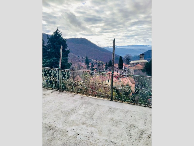 Salendo al primo piano, l’ingresso con disimpegno conduce alla cucina abitabile e alla sala da pranzo, rinnovate, con solai nuovi, e affacciate sulla terrazza panoramica di circa 30 mq, vero punto focale della casa, sospesa sopra la vallata.