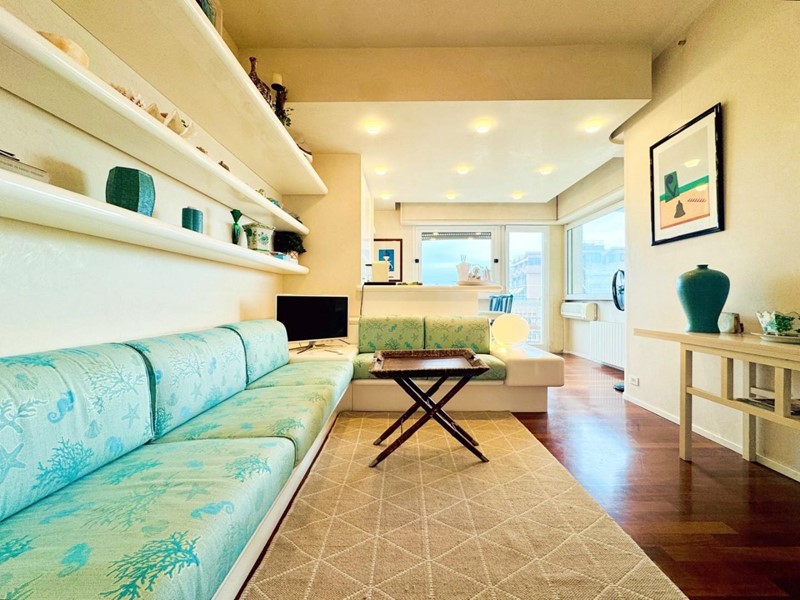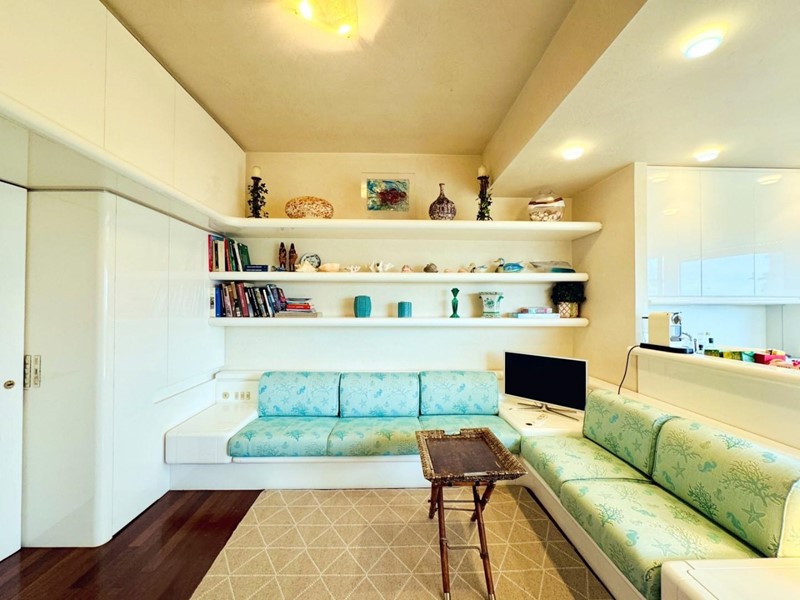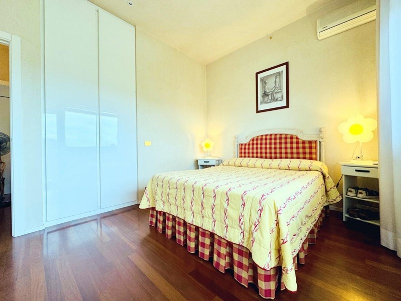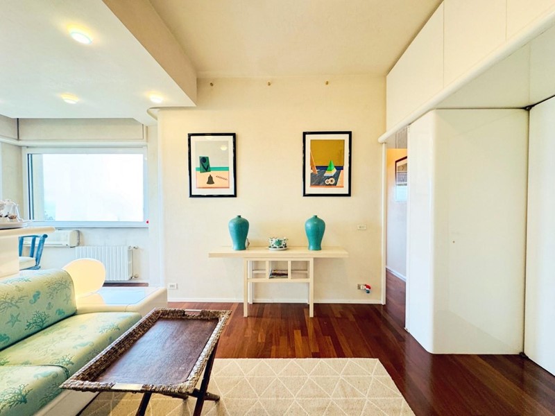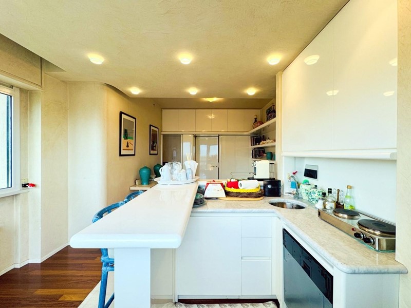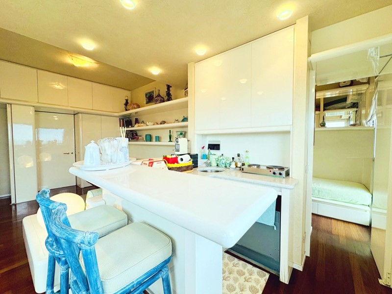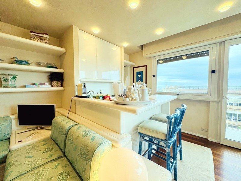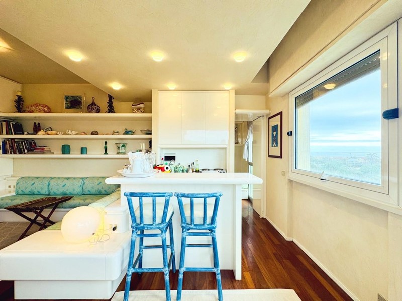 L'ingresso all'abitazione avviene direttamente nella zona giorno. La comoda superficie ospita una graziosa isola cucina con sgabelli. Il soggiorno è spazioso e servito da un pratico divano. La zona giorno di oltre 25 mq fruisce di generose aperture che regalano una pregevole vista sul mare oltre che luce ed aria alla stanza. Attraverso la porta a finestra si fuoriesce sul primo terrazzo. La zona notte si compone di una cameretta ed una camera matrimoniale. La camera matrimoniale dispone di una seconda terrazza (più grande rispetto alla prima) dalla quale si gode sia di una vista sulle Alpi Apuane che sul litorale. Il bagno a corredo è servito da doccia.