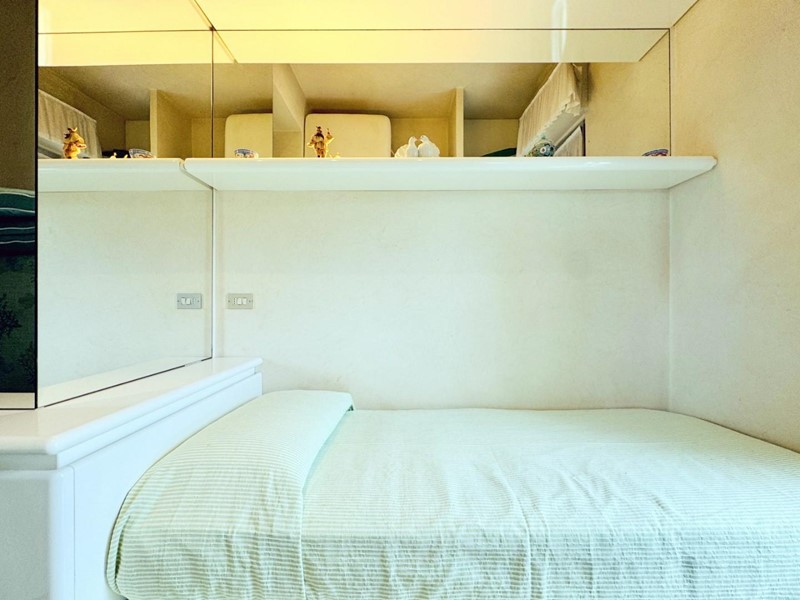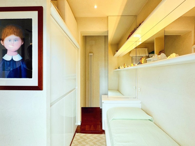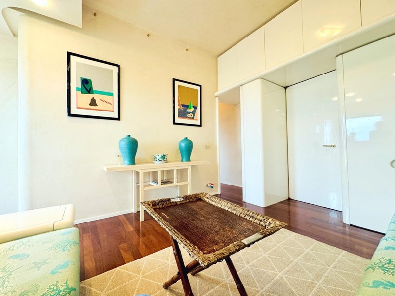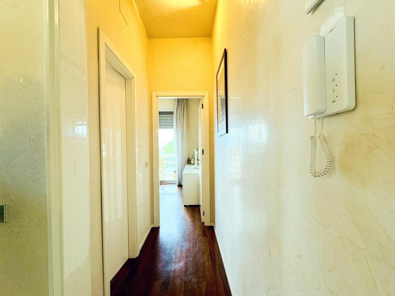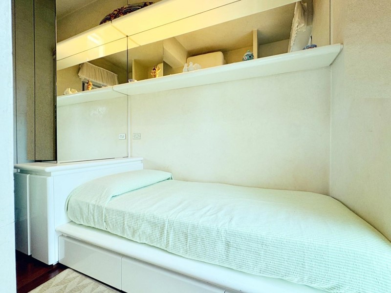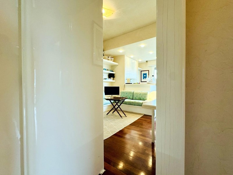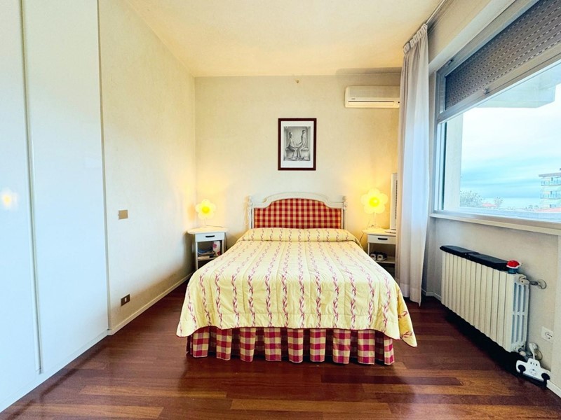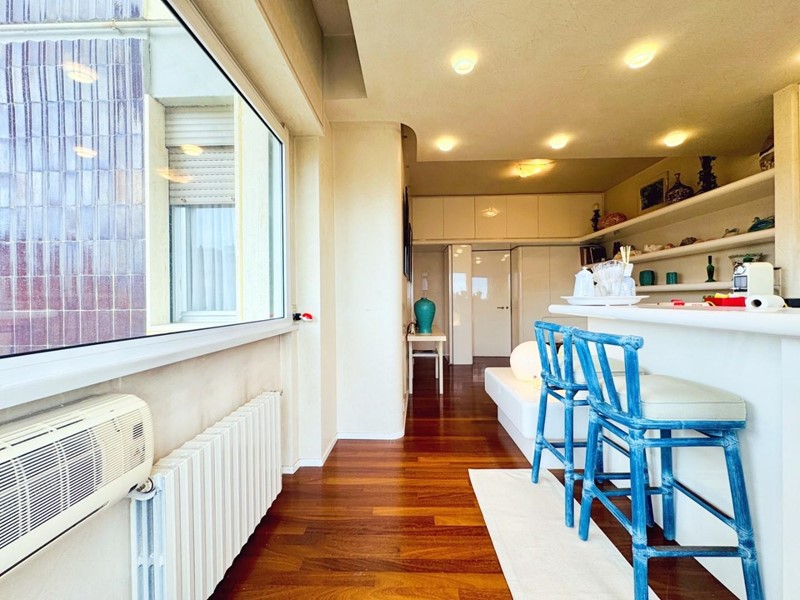 L'ingresso all'abitazione avviene direttamente nella zona giorno. La comoda superficie ospita una graziosa isola cucina con sgabelli. Il soggiorno è spazioso e servito da un pratico divano. La zona giorno di oltre 25 mq fruisce di generose aperture che regalano una pregevole vista sul mare oltre che luce ed aria alla stanza. Attraverso la porta a finestra si fuoriesce sul primo terrazzo. La zona notte si compone di una cameretta ed una camera matrimoniale. La camera matrimoniale dispone di una seconda terrazza (più grande rispetto alla prima) dalla quale si gode sia di una vista sulle Alpi Apuane che sul litorale. Il bagno a corredo è servito da doccia.