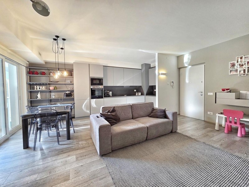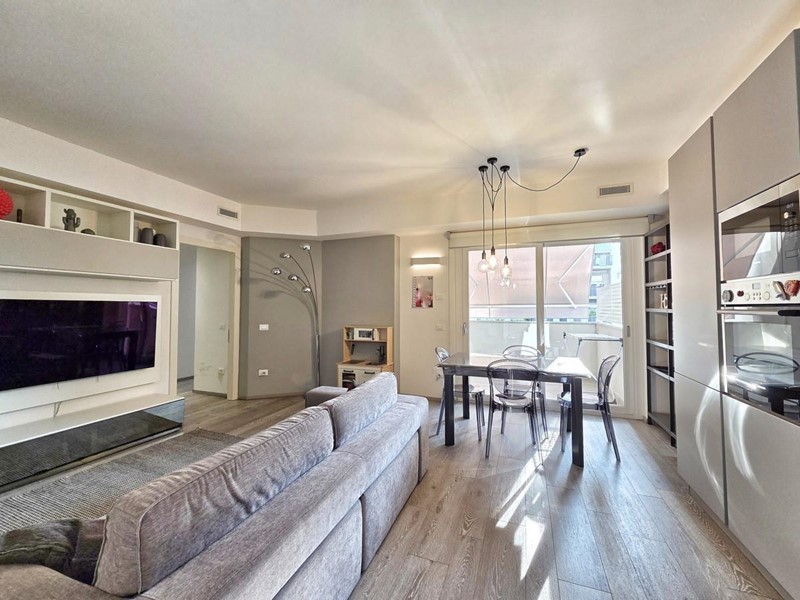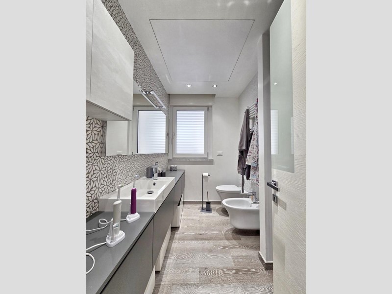 L'appartamento è composto da ampia zona giorno, prospiciente profonda terrazza e con cucina a vista, zona notte con due camere da letto, entrambe servite da ampio balcone, comodo ripostiglio e due bagni, ciascuno con doccia e finestra.