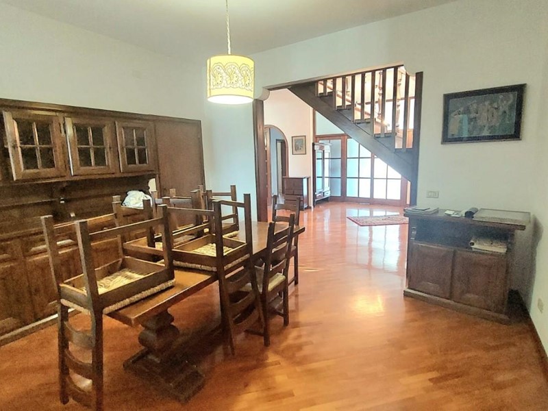 Dal salone si accede a una terrazza coperta con ulteriori due stanze, una con camino e una seconda cucina per uso domestico. La terrazza conduce tramite scala esterna al giardino privato, perfetto per animali domestici e momenti di relax.