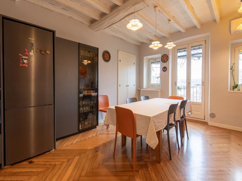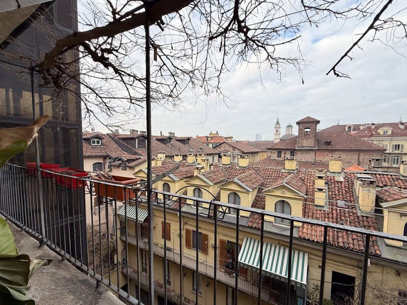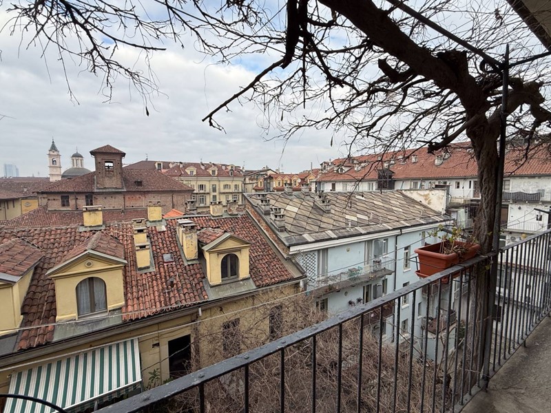 Lalloggio si trova al quarto e penultimo piano e gode di una vista panoramica straordinaria: dai tetti del centro storico alla collina torinese, fino alle Alpi.