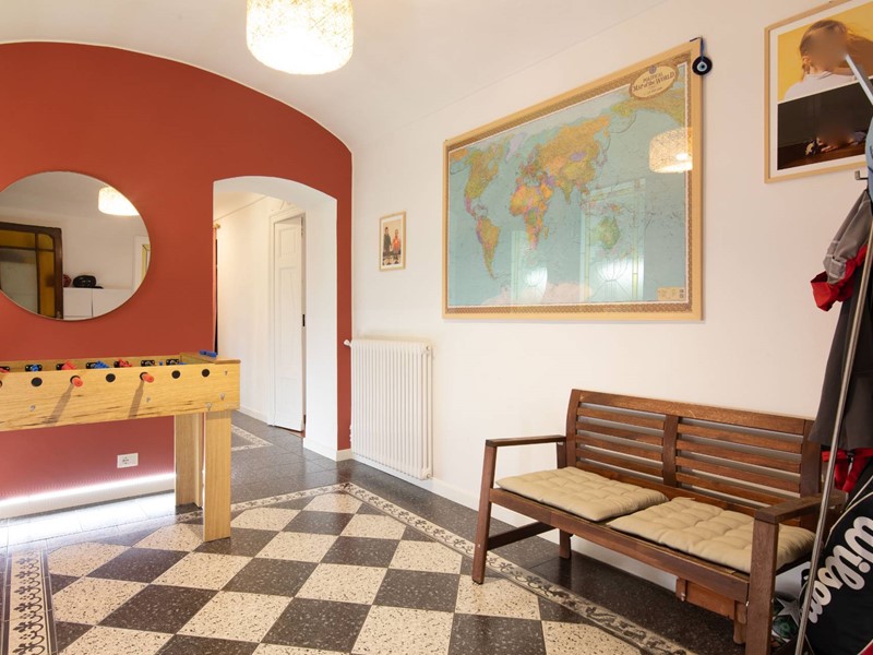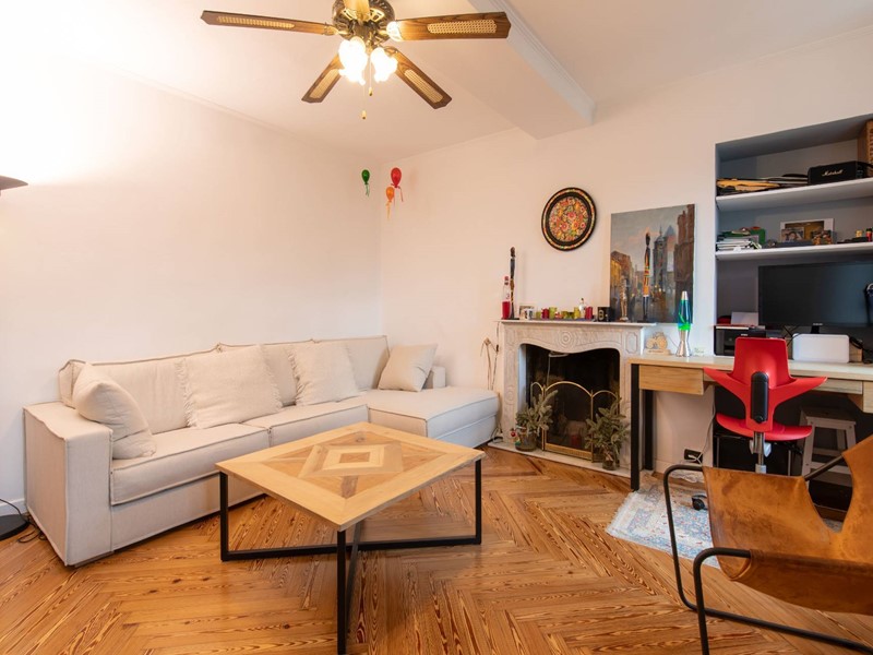 Lingresso conduce a un ampio salone con camino, caratterizzato da finestra e portafinestra che donano grande luminosità agli ambienti.