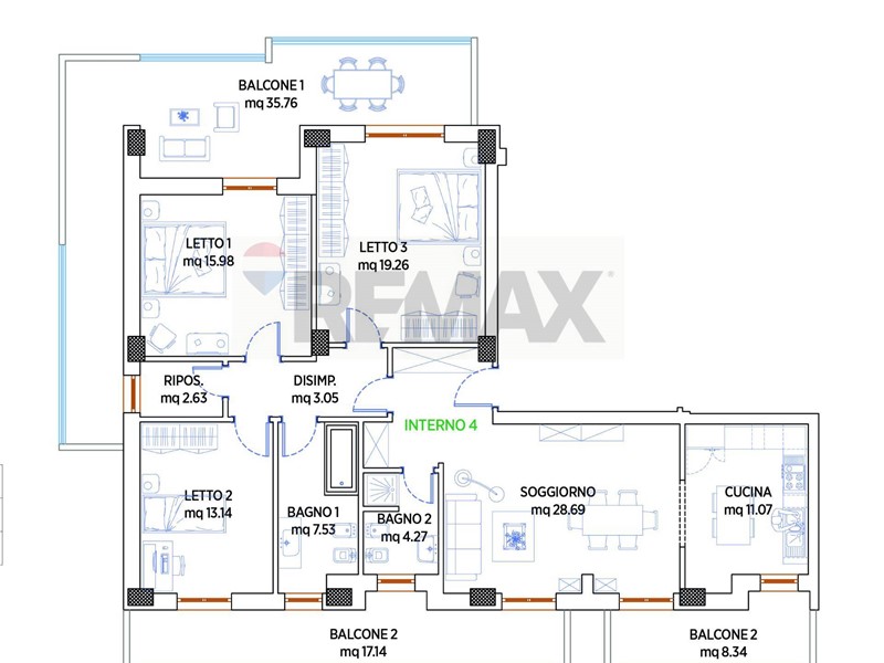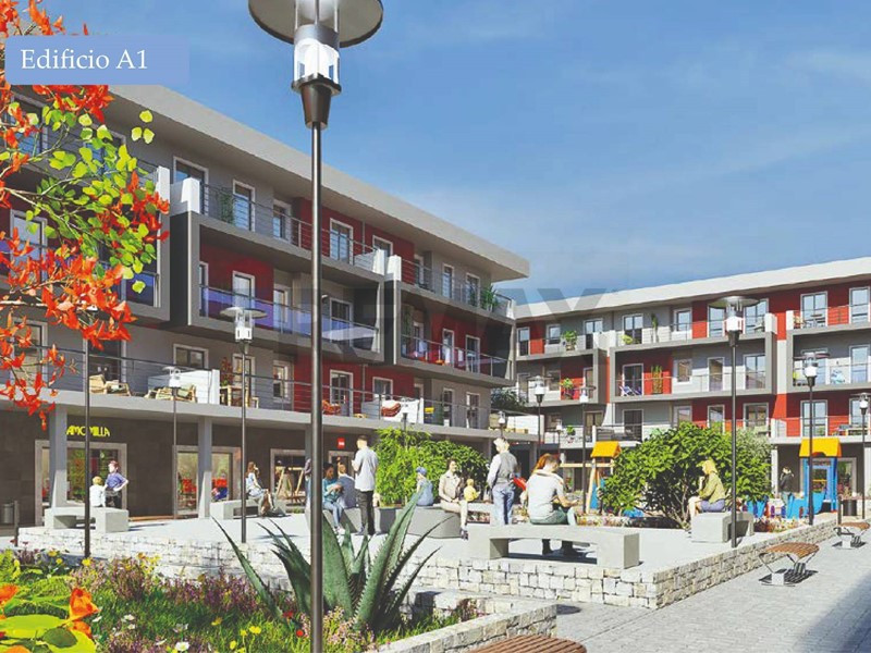79,62 mq ingresso/soggiorno/angolo cottura, 2 camere, 1 bagno, 1 ripostiglio, 2 balconi da 28,03 mq