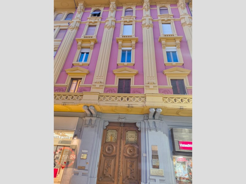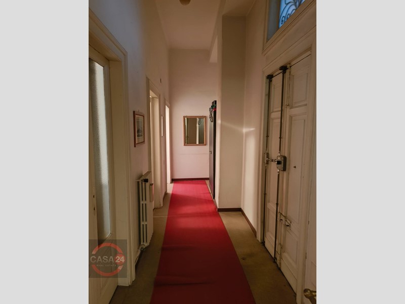 In prestigioso e storico condominio, offriamo un appartamento posto al primo piano, con doppio ingresso, (oggi unico appartamento costituito dalla fusione di due appartamenti); soffitti alti di 3,90 mt, composto da ben 6 vani ampi e luminosi, oltre WC, disimpegno e ripostiglio.