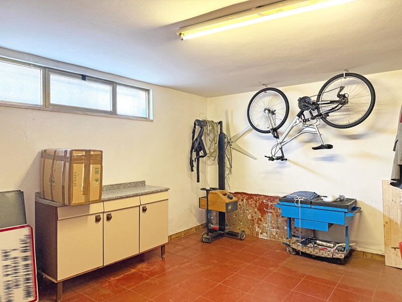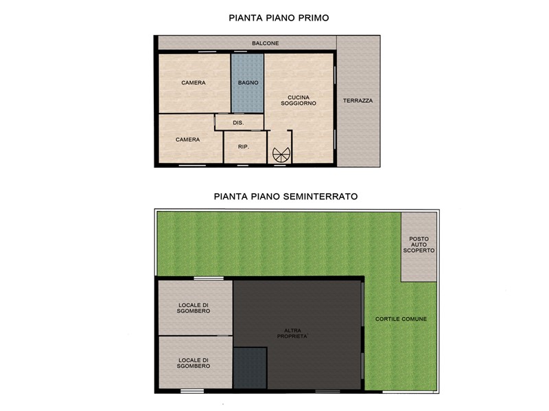 Al piano seminterrato, con accesso esclusivamente esterno, sono presenti due locali cantina ad suo esclusivo per una superficie complessiva di circa 43 mq, oltre ad un posto auto scoperto di proprietà e un cortile comune.