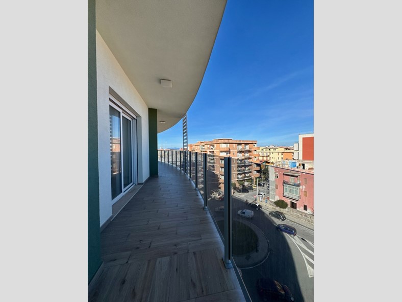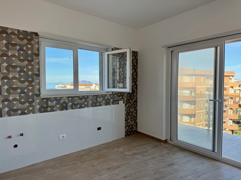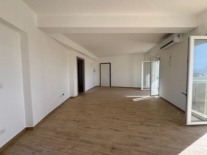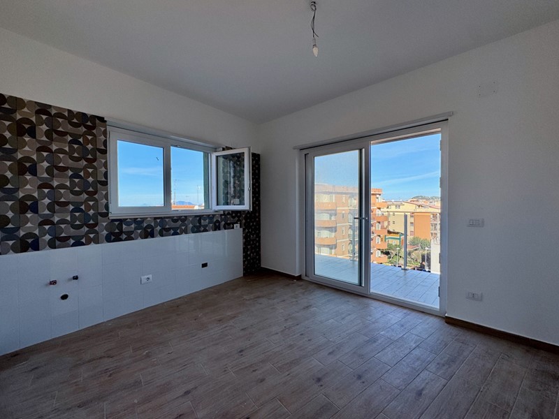 All'ingresso ci accoglie un'ampia e luminosa zona living con doppio affaccio sia lato monti, dove troviamo la verandina con vano tecnico, sia lato mare e centro città.