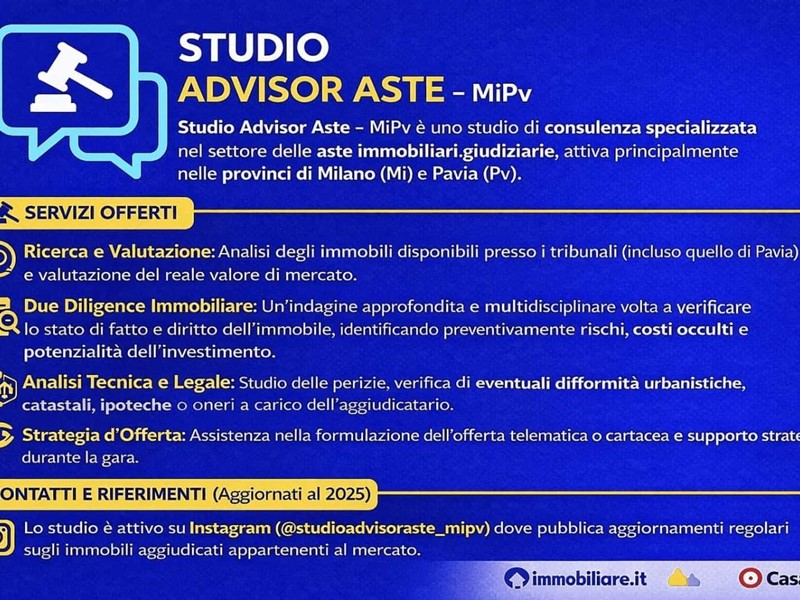 Questo annuncio è stato redatto da Studio Advisor Aste MiPv sulla base della documentazione ufficiale di vendita. Le informazioni qui riportate non sostituiscono la pubblicità legale e potrebbero contenere imprecisioni o variazioni rispetto agli atti ufficiali. Studio Advisor Aste MiPv declina ogni responsabilità per errori, omissioni o modifiche intervenute successivamente alla pubblicazione.