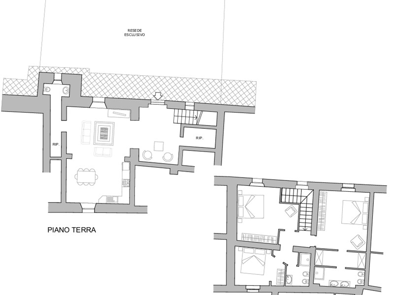 Piano terra: ingresso indipendente, zona living con cucina a vista, accesso al giardino/resede di 120mq., tre camere da letto, tre bagni e ripostiglio.