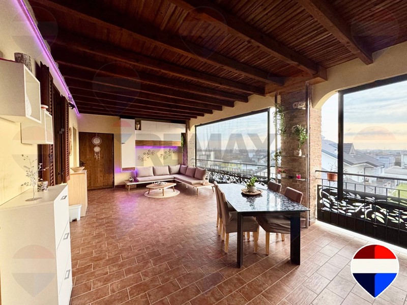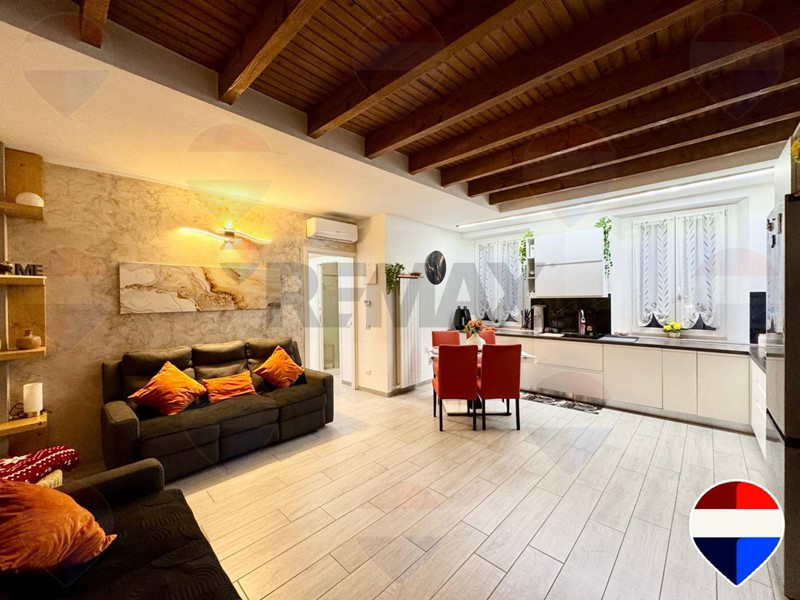 Dal terrazzo si entra allinterno dellappartamento, dove si apre un soggiorno luminoso con cucina a vista, impreziosito dalle travi a vista e da una distribuzione degli spazi funzionale e accogliente. Il disimpegno accompagna alla zona notte, composta da un bagno finestrato completamente rinnovato e da due camere matrimoniali. Una delle due camere gode delluscita diretta sul terrazzo, dettaglio che aggiunge comfort e versatilità allabitazione.