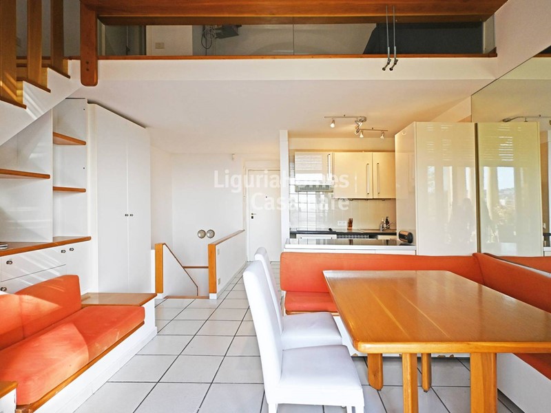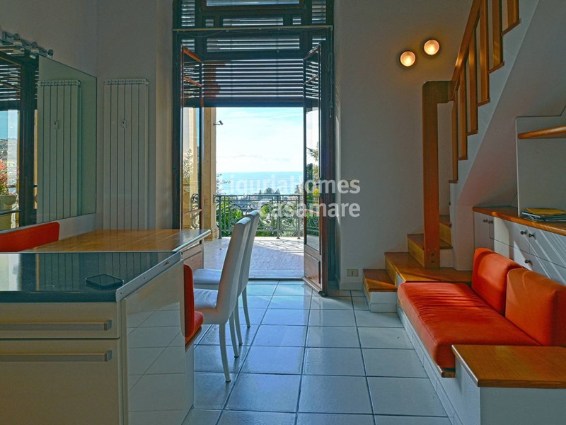 Il piano di arrivo offre la luminosa area soggiorno/pranzo con cucina con accesso al meraviglioso e ampio terrazzo porticato. Gli alti soffitti hanno permesso di creare un soppalco dove troviamo una salotto o eventuale zona letto, ed un bagno. Al piano giardino troviamo un disimpegno con armadi, una camera matrimoniale con bagno en-suite, una ulteriore camera matrimoniale con uscita sul giardino privato e un altro bagno. Una comoda cantina, accessibile anche direttamente dall'appartamento e un garage privato sono inoltre compresi nella vendita di questo esclusivo appartamento a Sanremo.