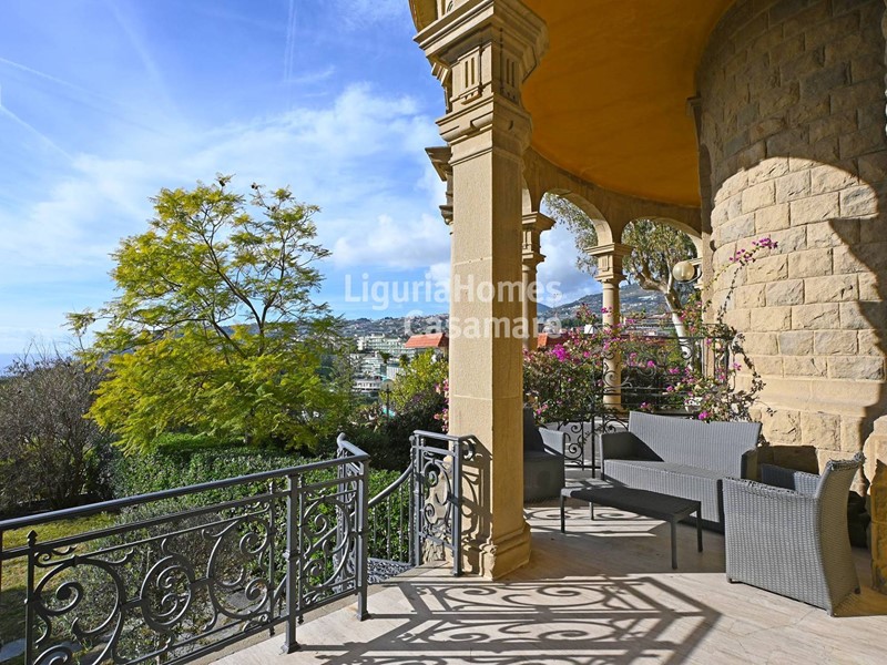 Sanremo, prestigioso appartamento in vendita all'interno dell'elegante Castello Devachan, con terrazza, giardino privato, vista mare e garage.