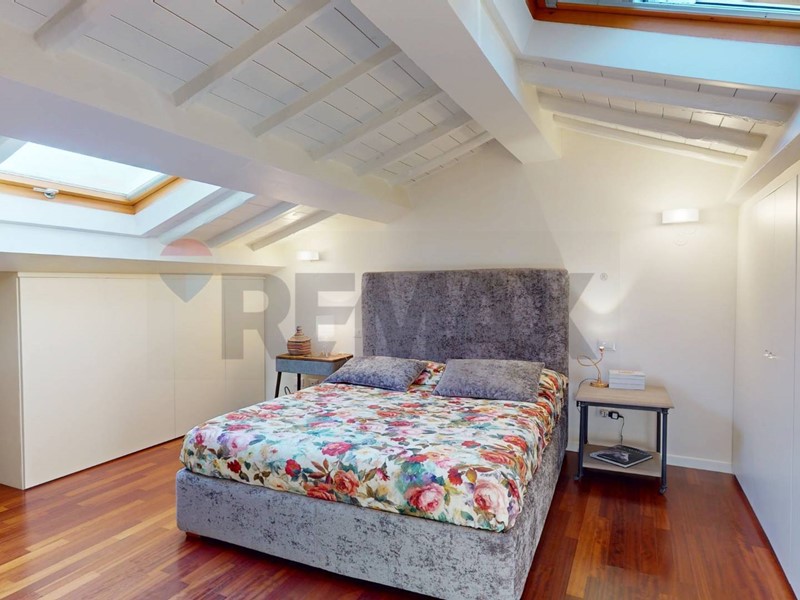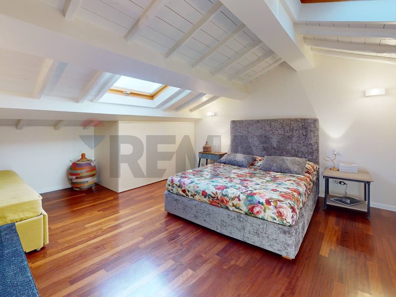 Piano superiore mansardato: seconda camera matrimoniale, bagno con vasca e piccola cabina armadio.