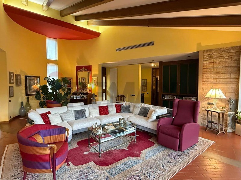 Il cuore pulsante della zona giorno è lampio soggiorno, un ambiente di grande fascino, valorizzato da ampie vetrate panoramiche che dialogano con lesterno e inondano lo spazio di luce naturale. Elemento distintivo e iconico dellintero fabbricato è il muro stondato, una struttura architettonica morbida e avvolgente che rappresenta la vera firma stilistica della villa.