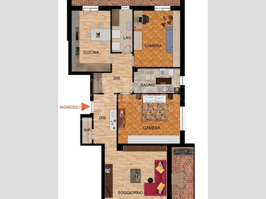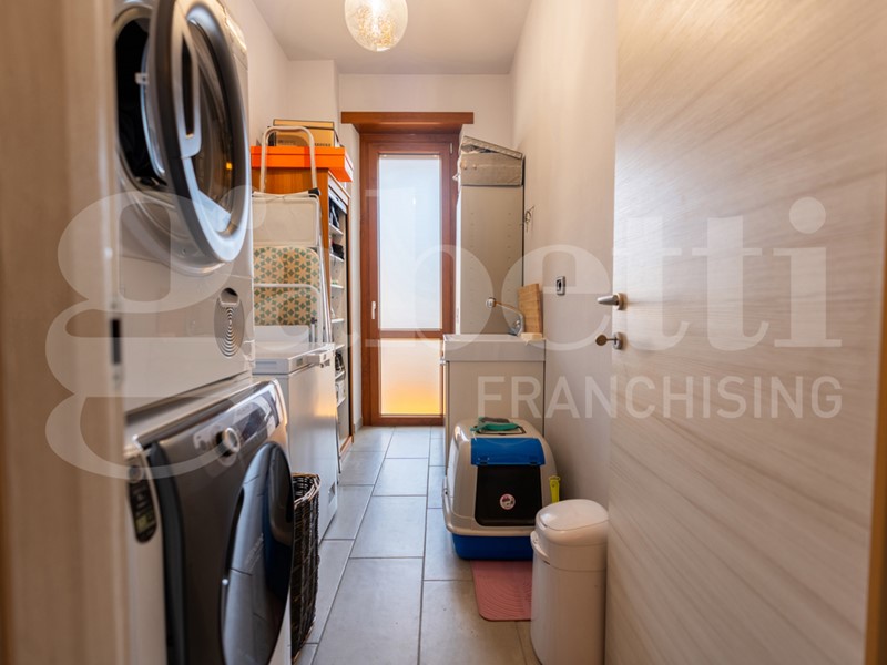 All'interno, sviluppato su di un unico livello, troviamo un ampio ingresso che introduce al luminoso soggiorno-salotto, caratterizzato da ampie finestre, collegato a un affascinante terrazzino coperto. La cucina abitabile è uno spazio separato, anch'essa con accesso a un secondo terrazzino, dove si potrà preparare gustose pietanze per le vostre cene. La zona notte è ben distinta dal soggiorno e risulta composta da due ampie e spaziose camere matrimoniali. Due bagni aggiungono comfort: uno, finestrato e completo risulta elegante e moderno, arricchito dalla presenza di ribassamenti nel soffitto con luci a led mentre il secondo servizio è attualmente utilizzato come lavanderia in modo funzionale, offre l'opportunità di sfruttare la sinergia con l'esterno. Completa la parte abitativa uno spazioso ripostiglio sempre utile e richiesto.