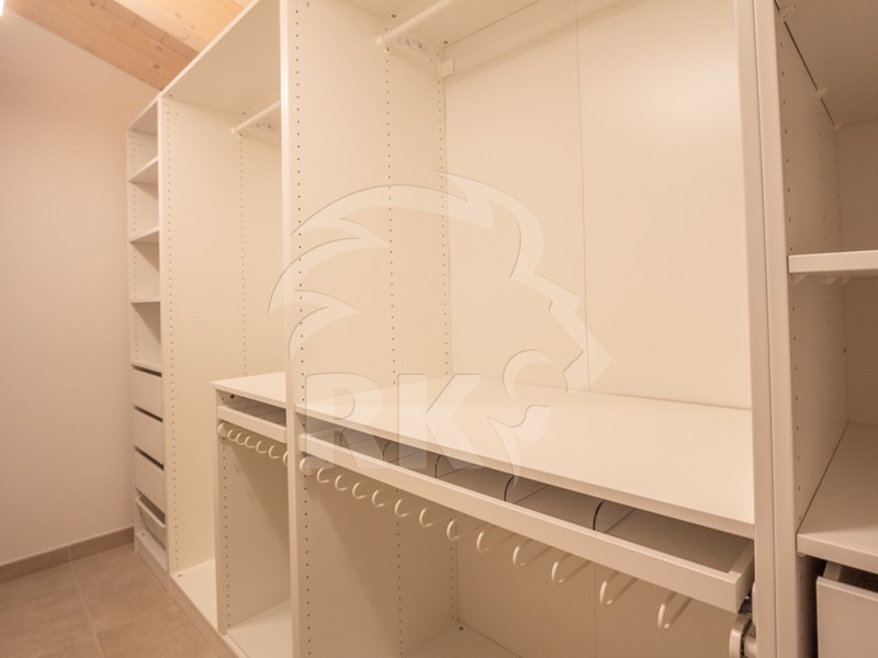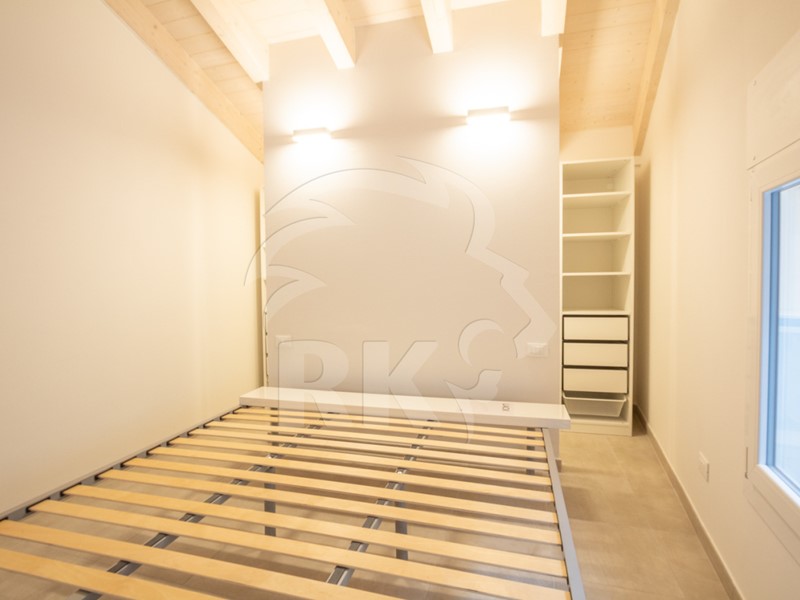 PARTE INTERNA - L'immobile si sviluppa al piano primo ed ultimo, con accesso dall'ingresso condominiale o dal piano autorimessa con cancello automatico. Le travi a vista e la modernità degli arredi lo rendono accogliente, funzionale ed elegante. Si entra nell'ampia zona giorno con angolo cottura, la cucina è dotata di induzione, lavastoviglie, forno elettrico e frigo/freezer, camera matrimoniale con letto contenitore, con bagno privato e cabina armadio, camera singola, altro bagno con doccia e lavatrice.