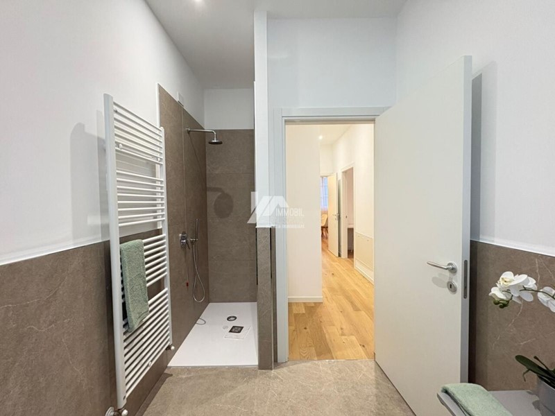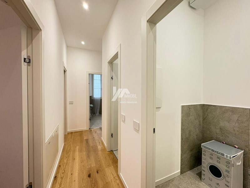 Dettagli di pregio: Elegante parquet in rovere (15 x 160/180) in tutta la casa, finiture in gres nei servizi, porte interne in laminato bianco con cerniere a scomparsa, soglie e davanzali in marmo.