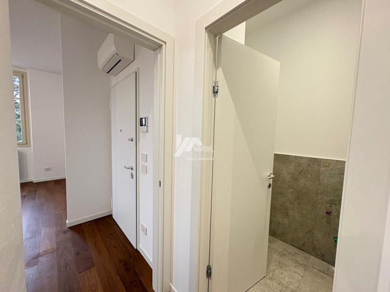 Dettagli di pregio: Elegante parquet in rovere (15 x 160/180) in tutta la casa, finiture in gres nei servizi, porte interne in laminato bianco con cerniere a scomparsa, soglie e davanzali in marmo.