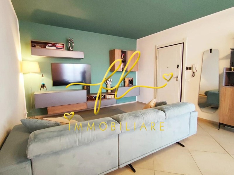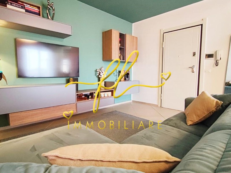 L’ingresso si apre su una grande zona giorno, moderna e accogliente, con angolo cottura ben integrato.