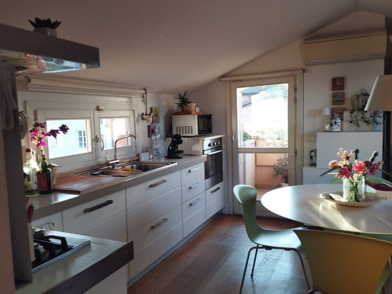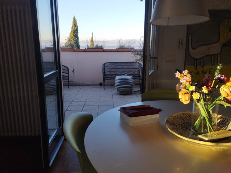Dalle scale interne si accede al piano superiore mansardato dove troviamo un ripostiglio, una particolare cucina su misura, un altro bagno con doccia finestrato, un terrazzino accessoriato ed un più ampio terrazzo a tasca con una spettacolare vista panoramica dove godersi tranquille cene al tramonto!
