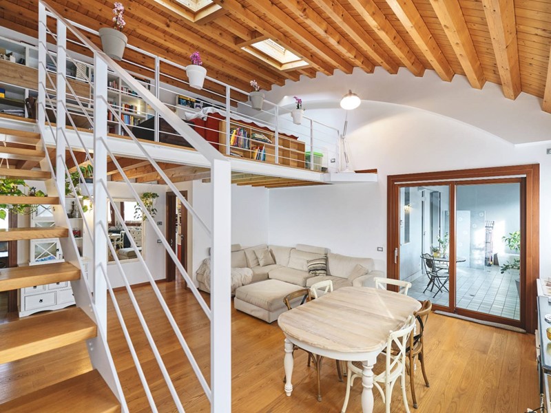 La zona giorno è composta da ingresso sull'ampio soggiorno con sala da pranzo e accesso diretto a una grande terrazza, cucina abitabile e soppalco raggiungibile da scala interna, ideale come studio o area relax.