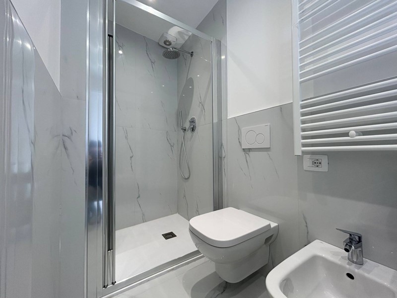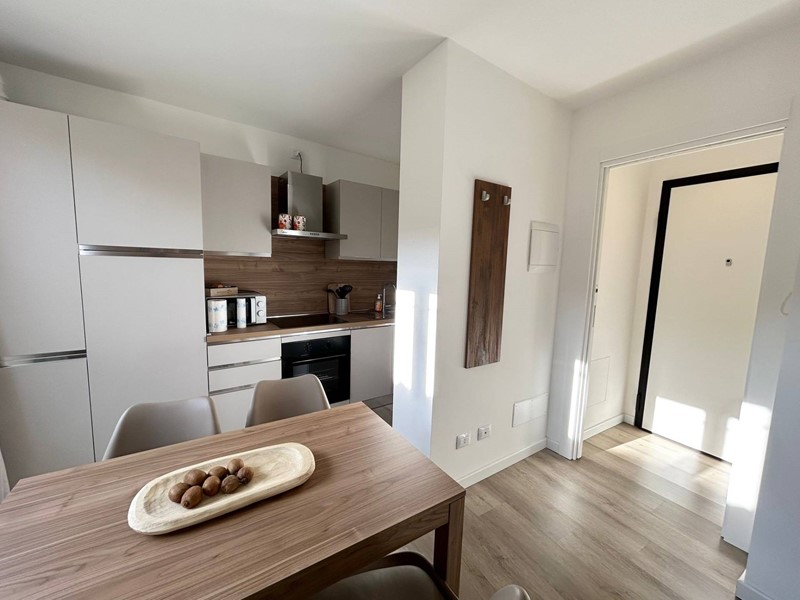 Lingresso si apre su un comodo disimpegno, che accompagna a un elegante bagno con box doccia moderno. Lambiente principale è un unico spazio armonioso e luminoso, curato nei dettagli, dove convivono con equilibrio zona living, angolo cottura attrezzato e divano letto, offrendo comfort, funzionalità e stile in ogni angolo.