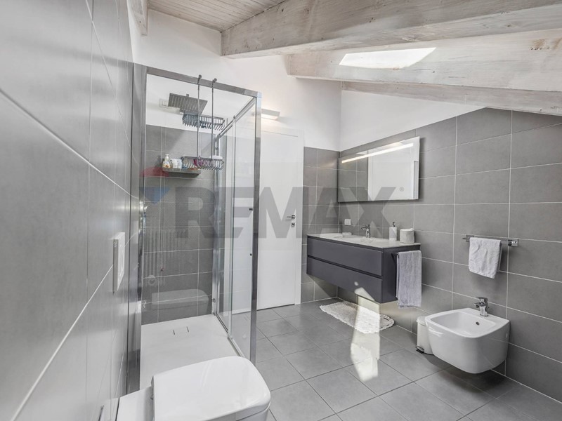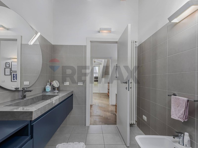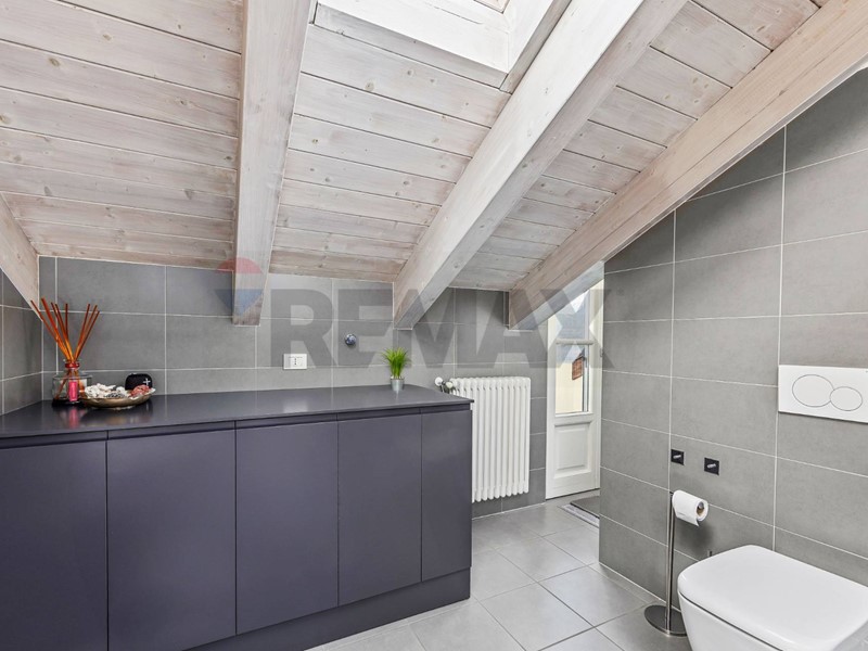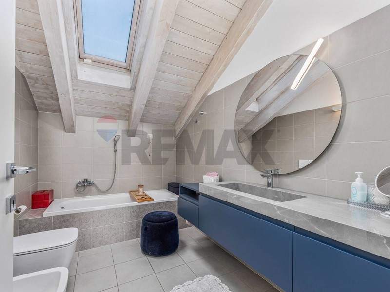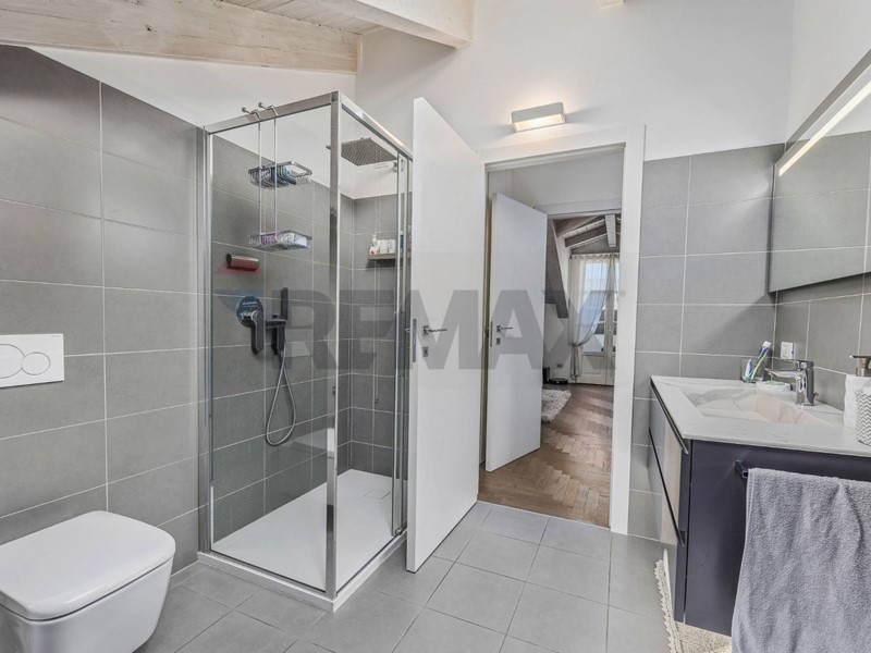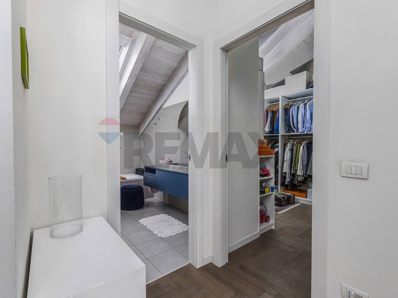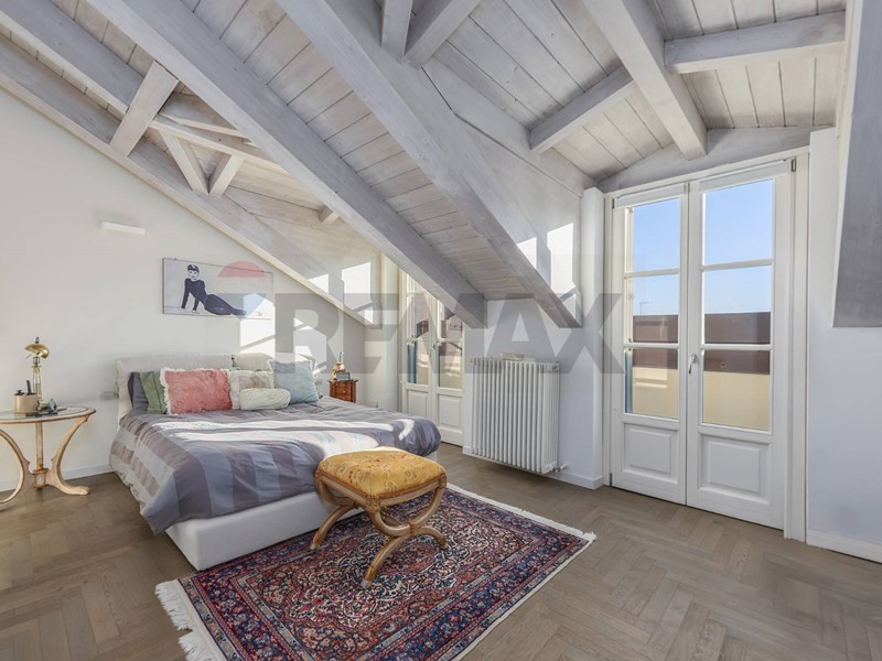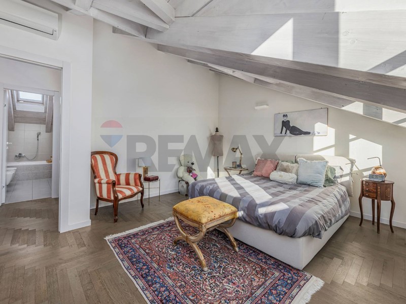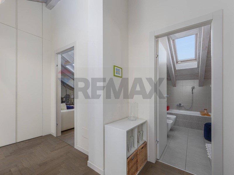 Caratteristiche e finiture : sono di qualità e in ottimo stato, nel dettaglio: Pavimenti in Rovere a spina di pesce in tutta la casa, ceramica di qualità nei bagni; Serramenti in legno doppio vetro con zanzariere in camera da letto; Lucernari con oscuranti motorizzati centralizzati; Impianto di aria condizionata ad acqua; Allarme perimetrale; Video citofono, Portoncino blindato. A livello condominiale : Riscaldamento centralizzato (caldaia del 2021); Pannelli solari per produzione Acs centrale termica; Fotovoltaico per produzione elettricità.