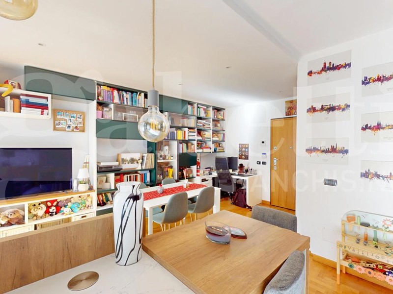L'appartamento, rifinito con estrema cura e materiali di pregio, si apre su un luminoso soggiorno con cucina a vista. La zona notte è composta da una camera matrimoniale, una camera singola e due bagni finestrati (uno con box doccia e uno con vasca). Il parquet uniforme in tutti gli ambienti dona calore e continuità estetica a tutta la casa.