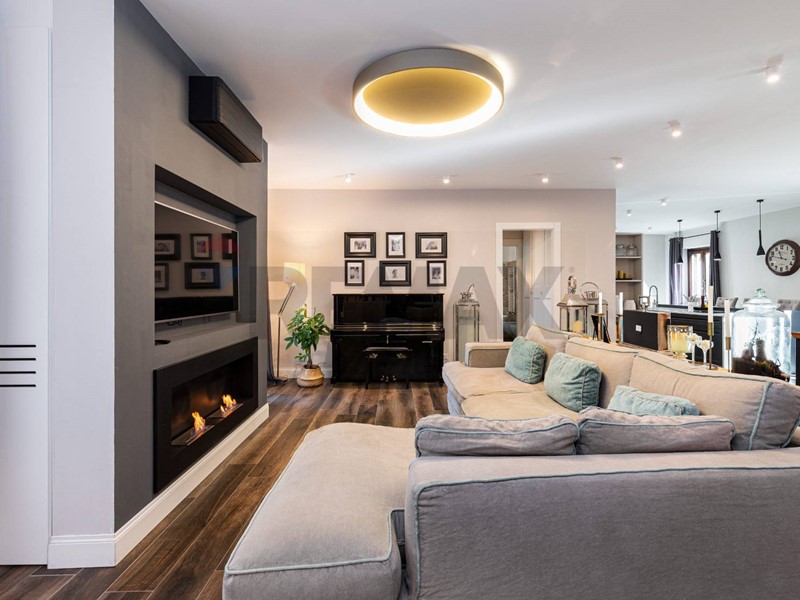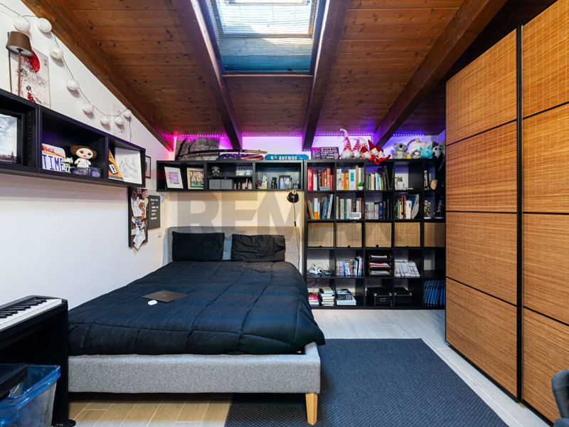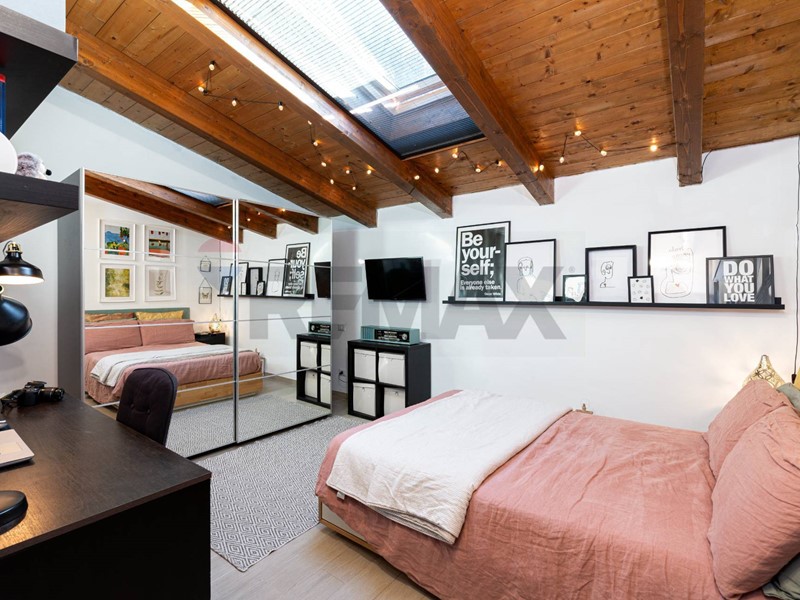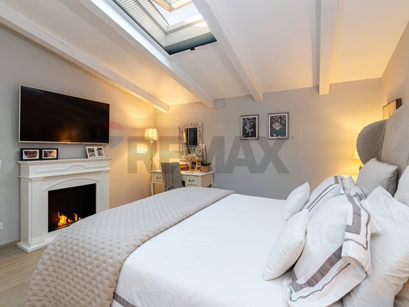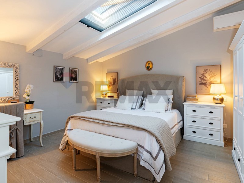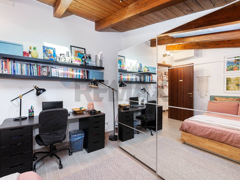 Il livello superiore è interamente dedicato alla zona notte e offre tre camere matrimoniali, ciascuna caratterizzata da ampi volumi e da una sensazione di comfort che raramente si incontra nel mercato locale. I tre bagni presenti su questo piano, uno dedicato a ciascuna camera, riflettono la stessa attenzione per materiali e soluzioni estetiche già percepita nel resto della casa. Completa il piano uno spazio esterno riservato, perfetto come area relax o come ambiente privato da vivere nelle giornate più miti.
