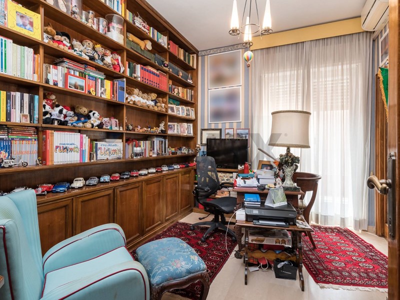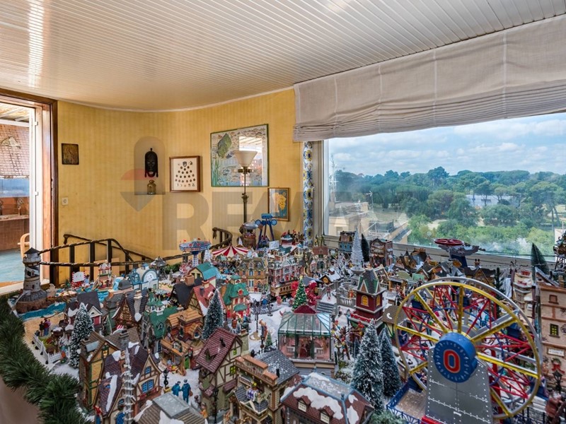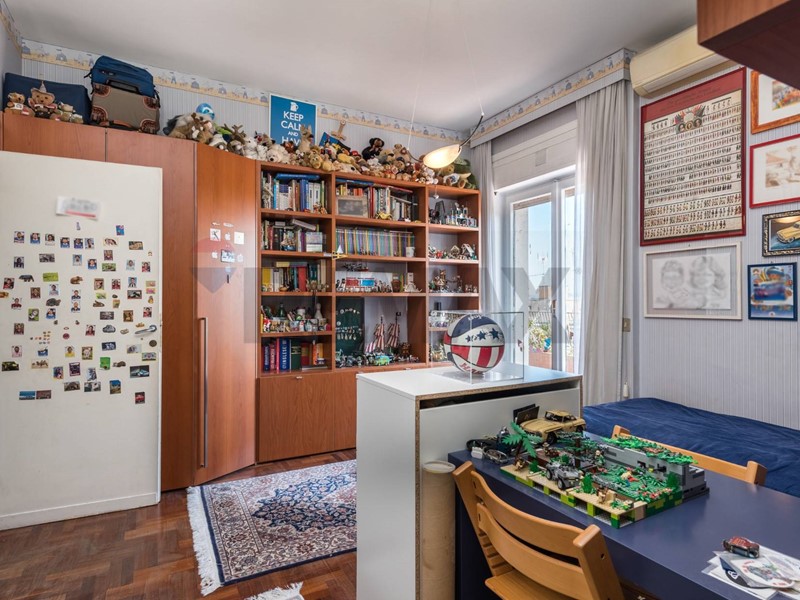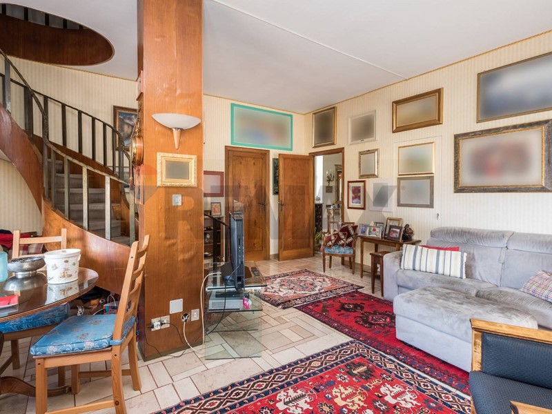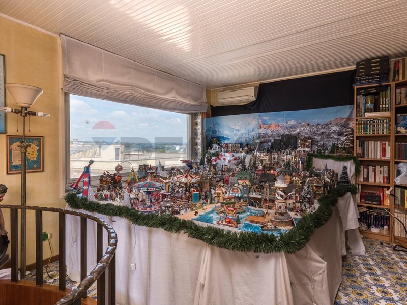 Al piano attico un grande ingresso ci conduce alla zona giorno, composta da un grande salone con vista sulla storica Villa Ada Savoia, collegato mediante una comoda scala ad uno studio di 25 mq con vista mozzafiato sulla città, servito da terrazza e veranda , grande cucina con dispensa e piccolo servizio.