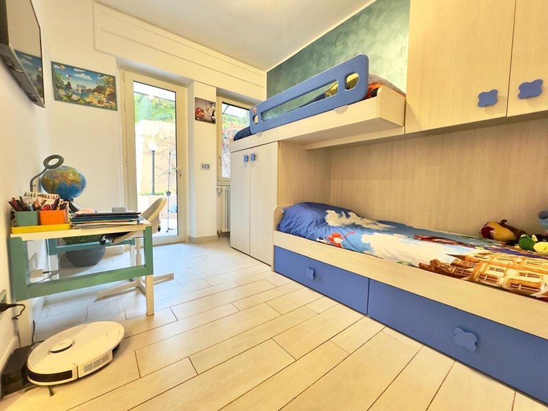 L’ingresso si apre su un comodo disimpegno che conduce a un grande soggiorno luminoso, cucina abitabile, doppi servizi, tre camere da letto e pratico ripostiglio. Tutti gli ambienti hanno accesso diretto al giardino/terrazzo perimetrale, che rende l’immobile particolarmente piacevole e vivibile.