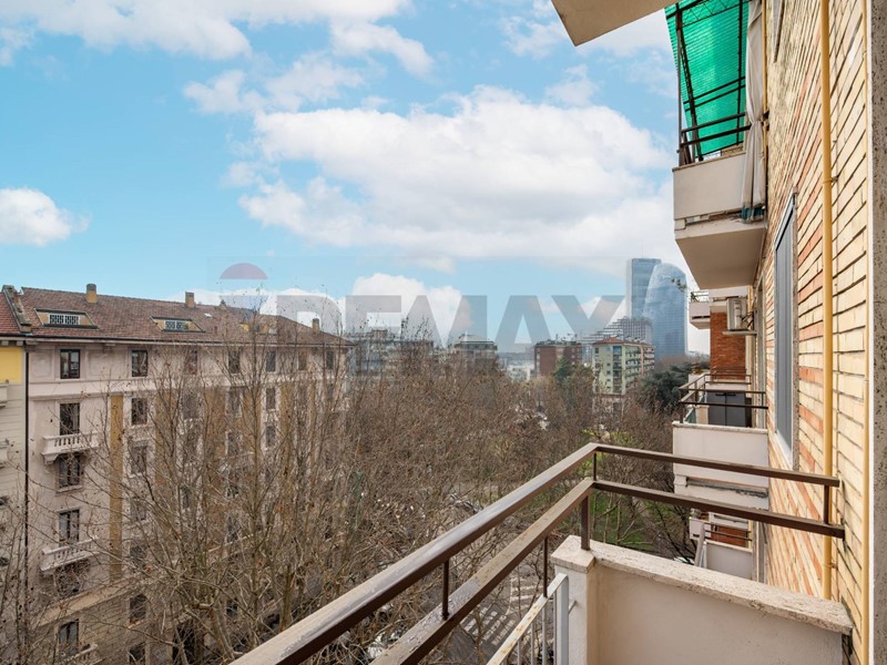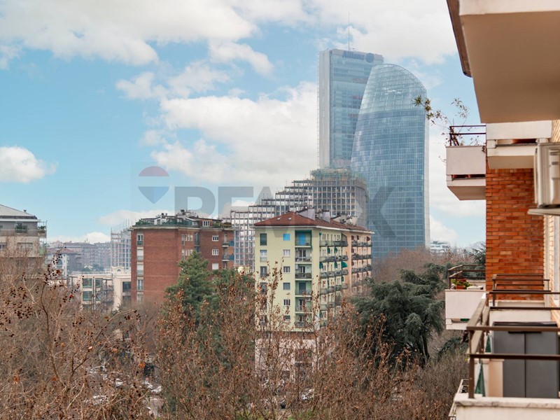 L'appartamento è composto da ingresso su disimpegno con armadi su misura, soggiorno doppio con cucina a vista e accesso al balcone con vista sulle torri di City Life, camera matrimoniale con cabina armadio e bagno finestrato en suite, seconda camera da letto matrimoniale con balcone e secondo bagno cieco con box doccia. Completa la proprietà una cantina di pertinenza.