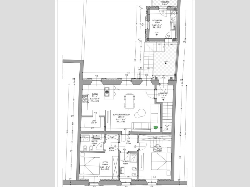 Ampia zona giorno con cucina , ripostiglio, due camere matrimoniale e un servizio , oltre a terrazzo e lavanderia separata.