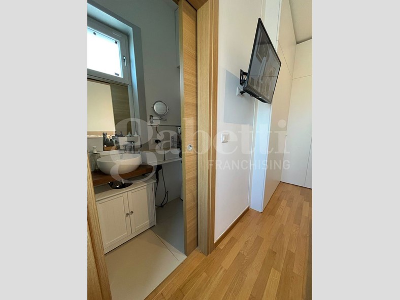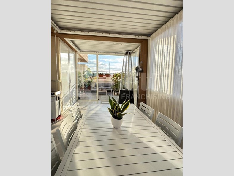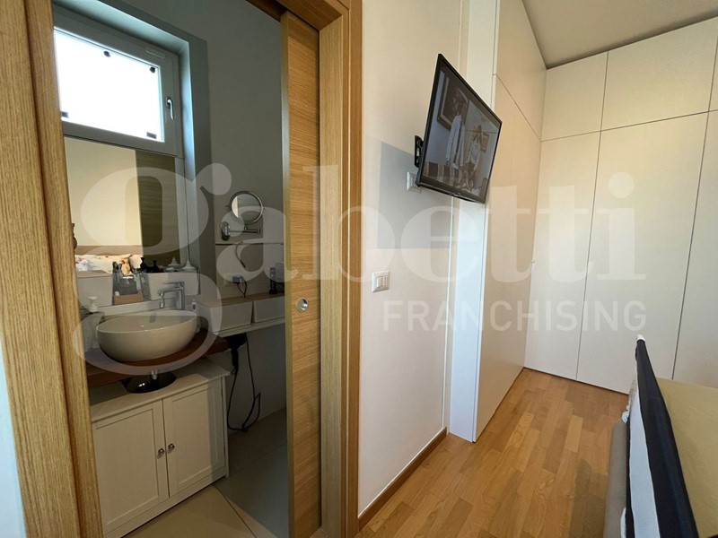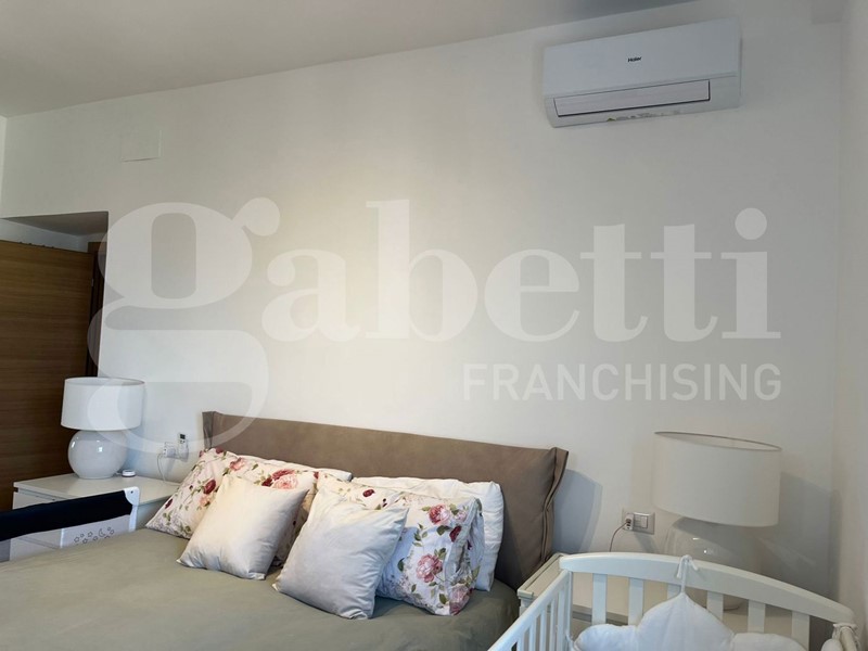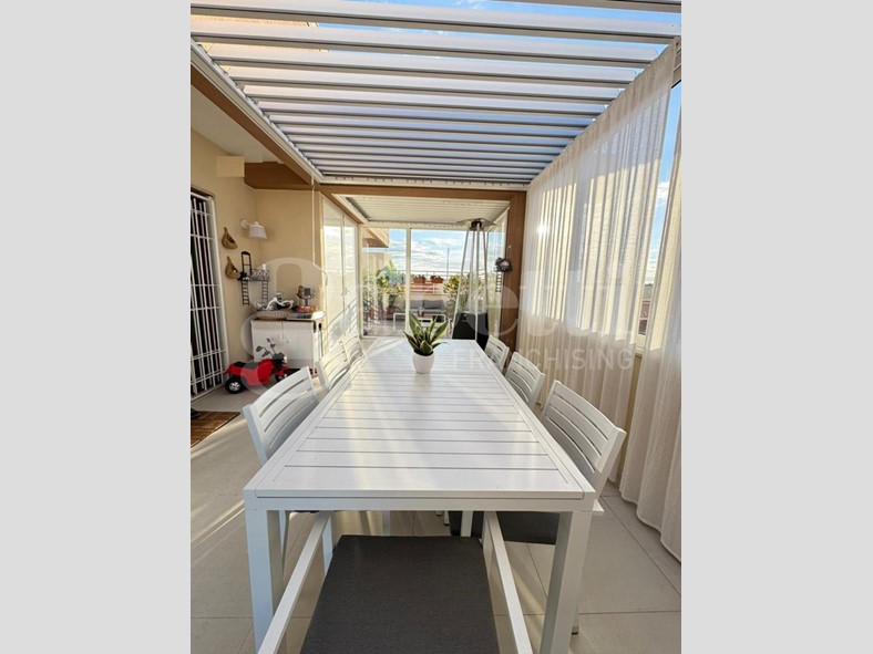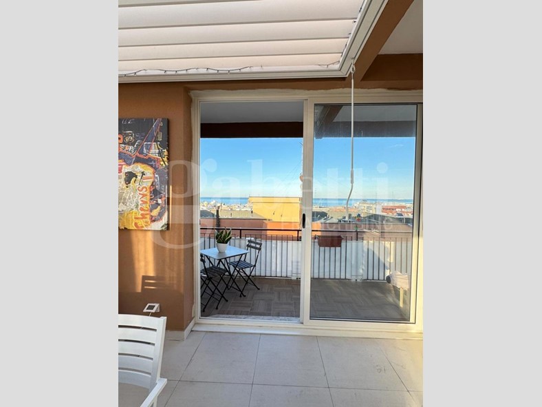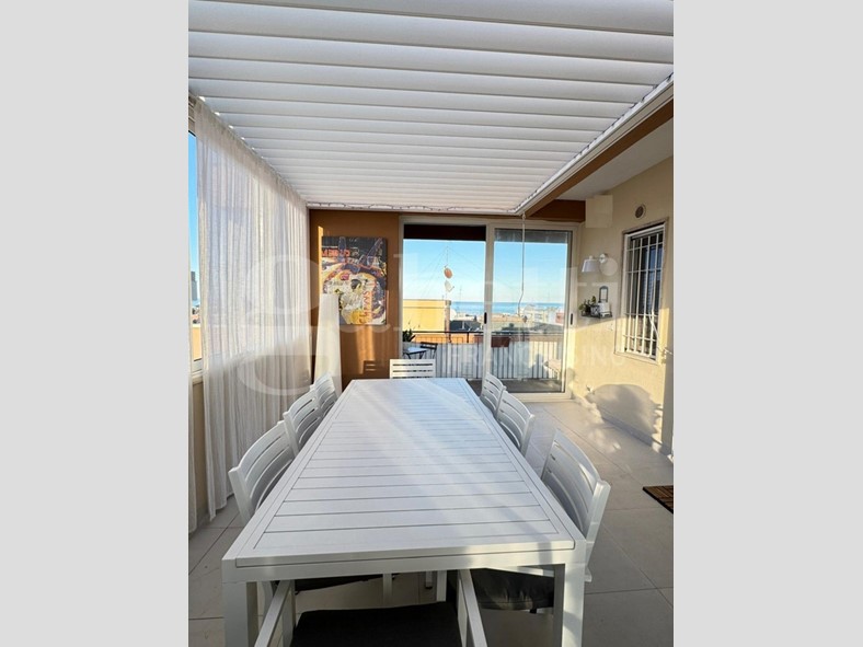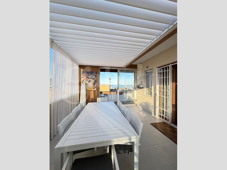 L'immobile si apre su un luminoso soggiorno con cucina open space, ambiente accogliente e ben organizzato, e dispone di due camere da letto, di cui una con bagno privato, oltre a bagno principale con antibagno, ripostiglio e deposito in mezzanina nella zona notte. Il balcone vista mare, e il terrazzo attrezzato con zona lavanderia, rendono la casa particolarmente piacevole: quest'ultimo è impreziosito da una pergola bioclimatica con alette orientabili, installabile senza necessità di autorizzazioni, ideale per vivere gli spazi esterni tutto l'anno.