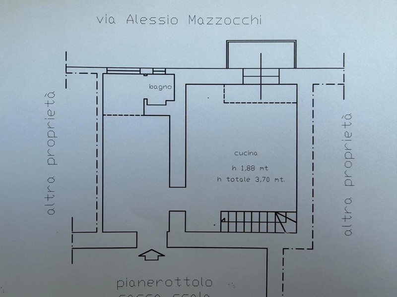 Gli spazi interni sono così distribuiti: ingresso, cucina abitabile ed un bagno; sul soppalco: disimpegno, due camere e bagno.