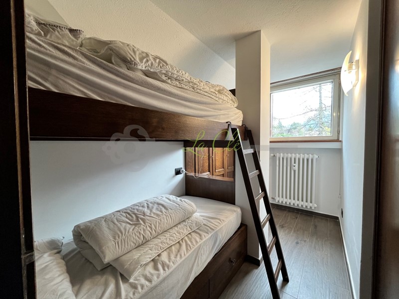 L'appartamento, al 7° ed ultimo piano con ascensore, è disposto su un unico livello, ed è così composto: ingresso sul soggiorno/pranzo dotato di divano letto doppio e accesso diretto al balcone soleggiato con splendida vista, cucinotto accessoriato di: piano cottura ad induzione, frigorifero grande e freezer, lavastoviglie e forno a microonde). La zona notte è composta da 1 camera matrimoniale con accesso al 2° balcone ed una 2° camera doppia con letti a castello e comoda armadiatura a muro, 1 bagno completo finestrato con box doccia e lavatrice. Completa la proprietà: posto auto esterno condominiale, 1 cantina/ski box.