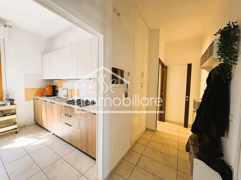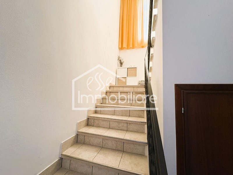 Dalla porta di ingresso si accede al vano scala (con a fianco un comodo ripostiglio/lavanderia) che ci conduce al primo piano dove, attraverso un disimpegno, con armadio a muro, entriamo nella zona giorno composta da una ampia sala con terrazza e da una cucina abitabile separata.
