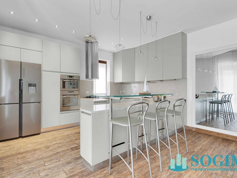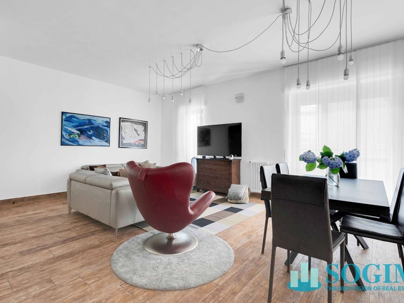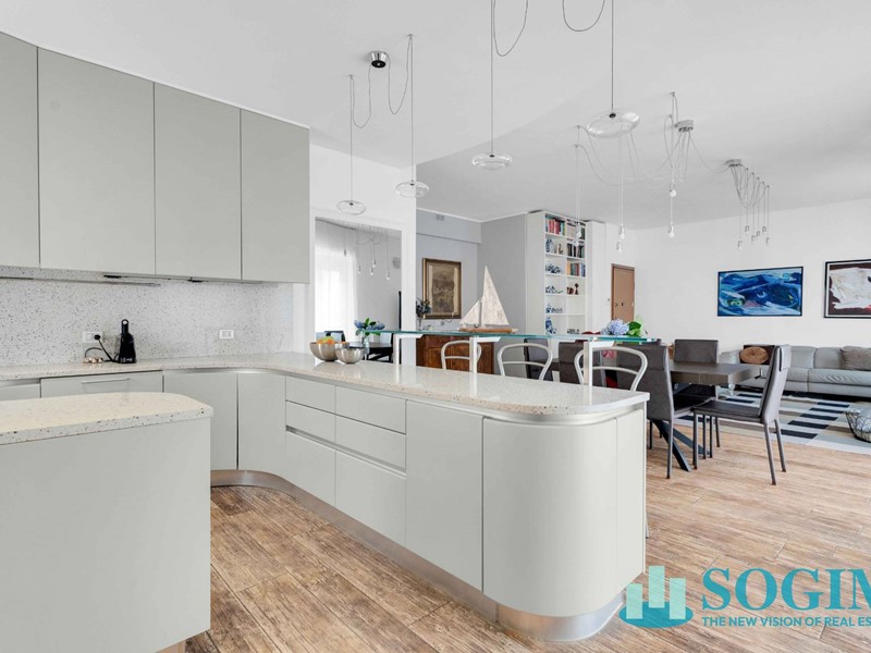 La proprietà ha una superficie complessiva di 226 mq commerciali, con tripla esposizione nord/est/sud e gode di doppio ingresso che garantisce piena autonomia ed indipendenza alle due abitazioni . Il quadrilocale, di 163 mq, si apre su unampia e luminosa zona living con soggiorno e cucina a vista marchiata Pedini, servita dal balcone che offre un'innegabile e piacevole apporto di luce naturale . Un disimpegno conduce alla zona notte, composta da una prima camera matrimoniale con guardaroba e balcone, un bagno finestrato con vasca e altre due camere matrimoniali, di cui una con bagno en-suite e accesso diretto alla terrazza privata, elemento raro nel contesto cittadino.