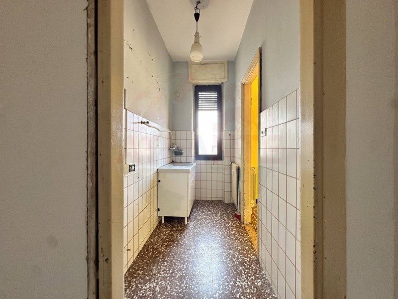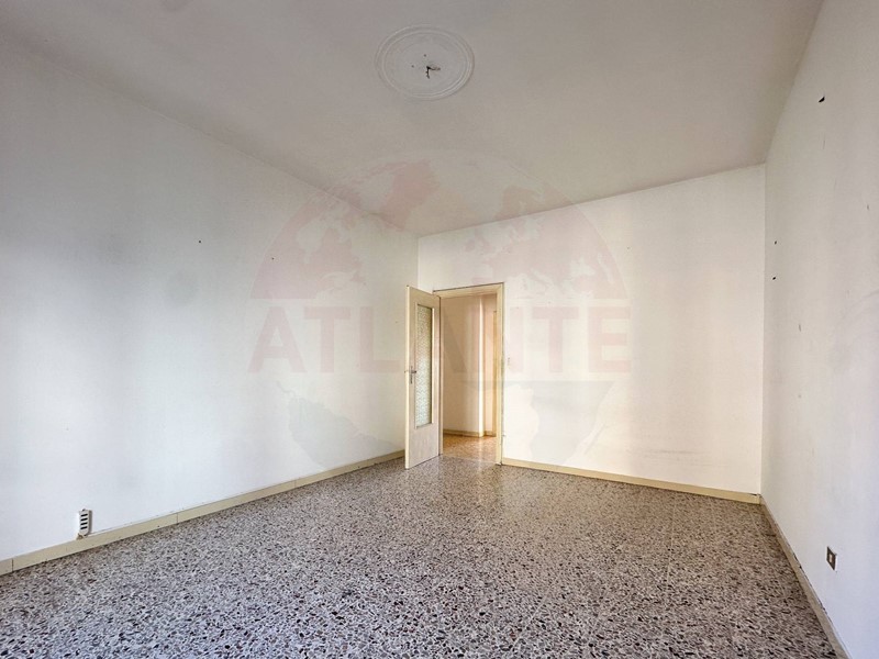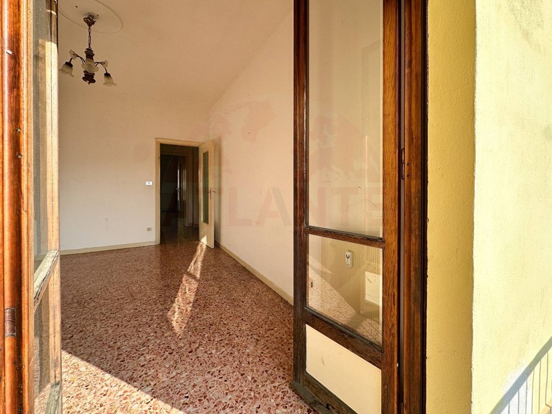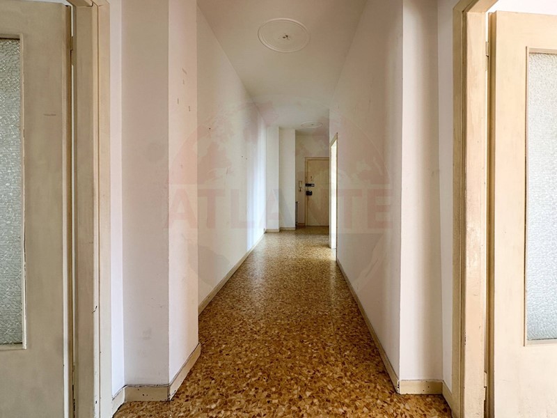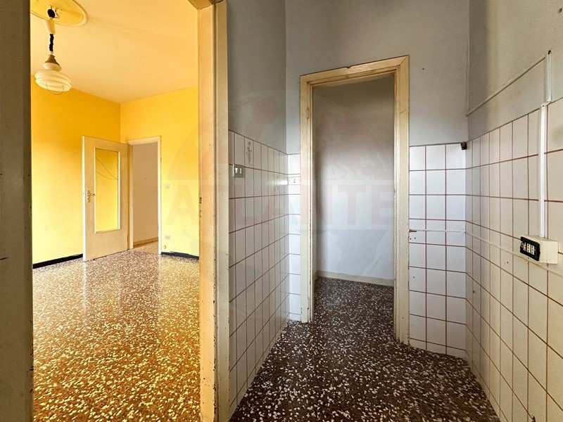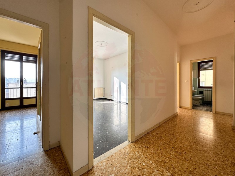 Lattuale distribuzione interna è la seguente: ingresso su ampio corridoio, cucinino con dispensa e sala da pranzo (circa 4,5 x 4,5 m), seguiti da salone e camera (circa 5 x 4 m ciascuna) che affacciano su un unico balcone. In fondo al corridoio si trova il bagno, mentre sul lato destro è presente una camera matrimoniale di generose dimensioni (circa 6 x 4 m) dotata di balcone dedicato.