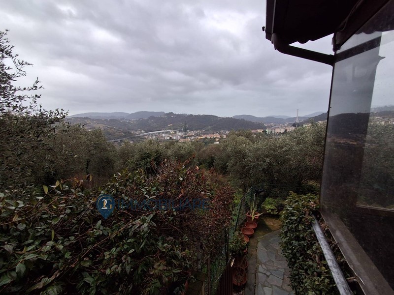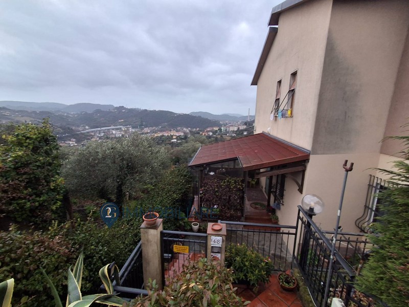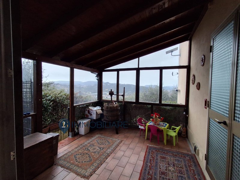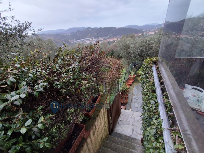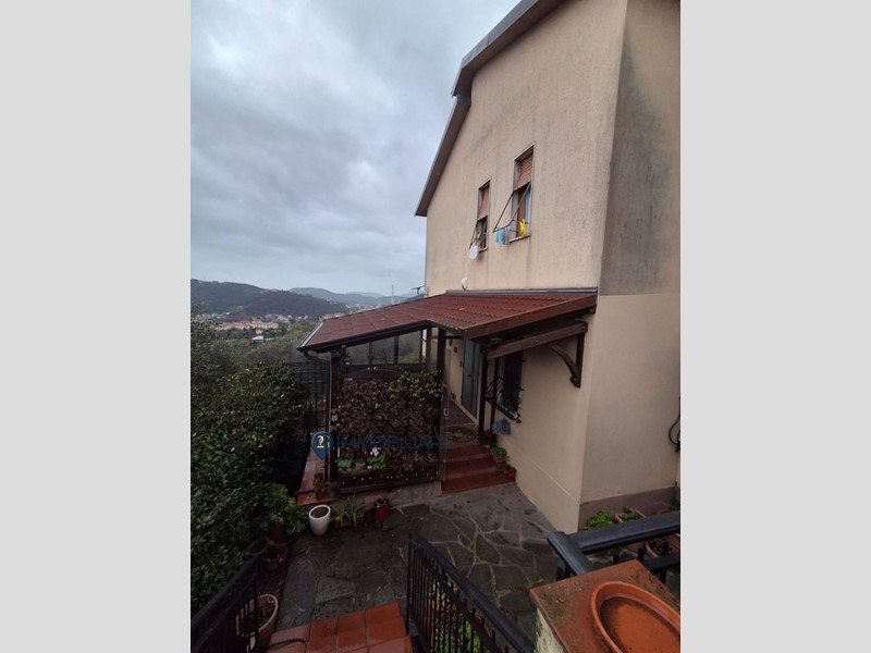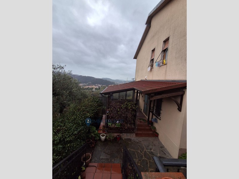 Rif. 340 Vezzano Ligure immerso nel verde e nella tranquillità con ampia vista su tutta la vallata e vista mare parziale, proponiamo in vendita appartamento in bifamigliare con ingresso indipendente in veranda di circa 15 mq, tramite portoncino blindato ci permette di entrare nel corridoio che serve tutti gli ambienti della casa, soggiorno con camino e cucina a vista molto ampia e luminosa, sulla destra troviamo la prima camera matrimoniale con cabina armadi, il bagno con doccia la seconda camera con cabina armadi, camera matrimoniale e ripostiglio/lavanderia.